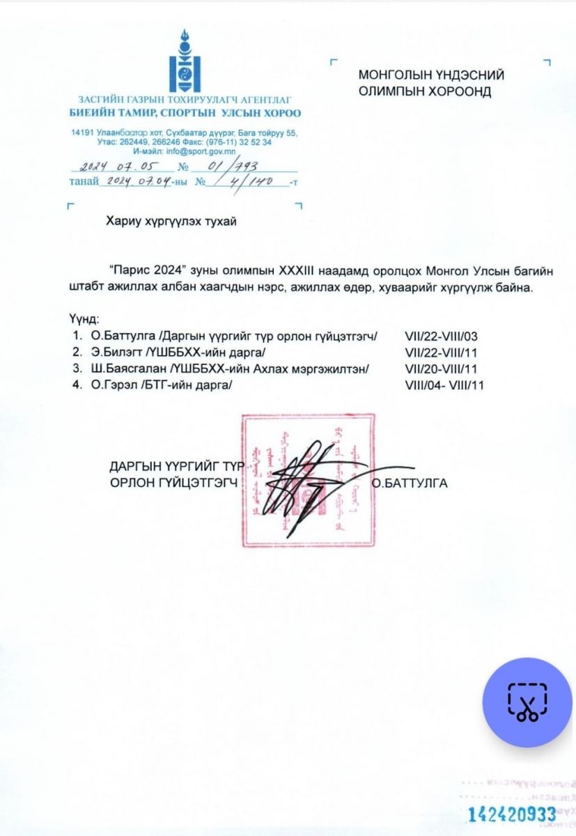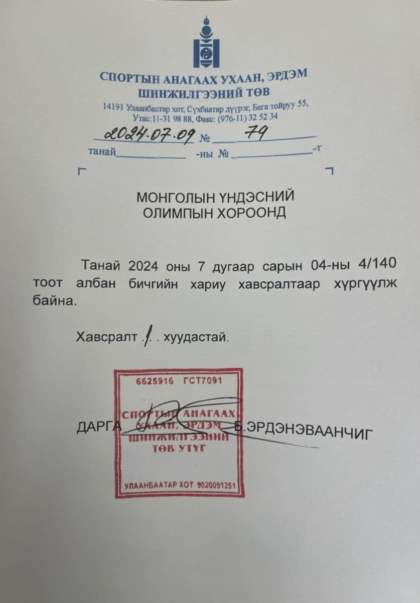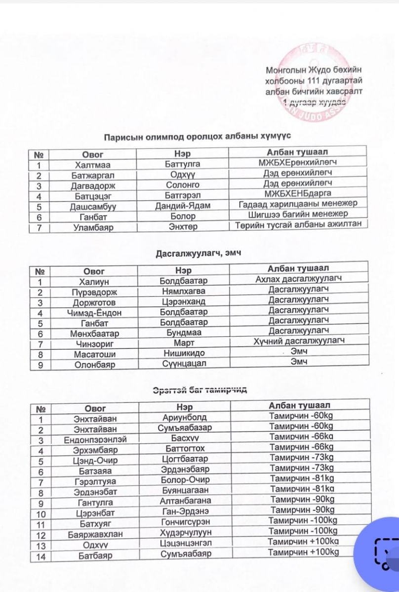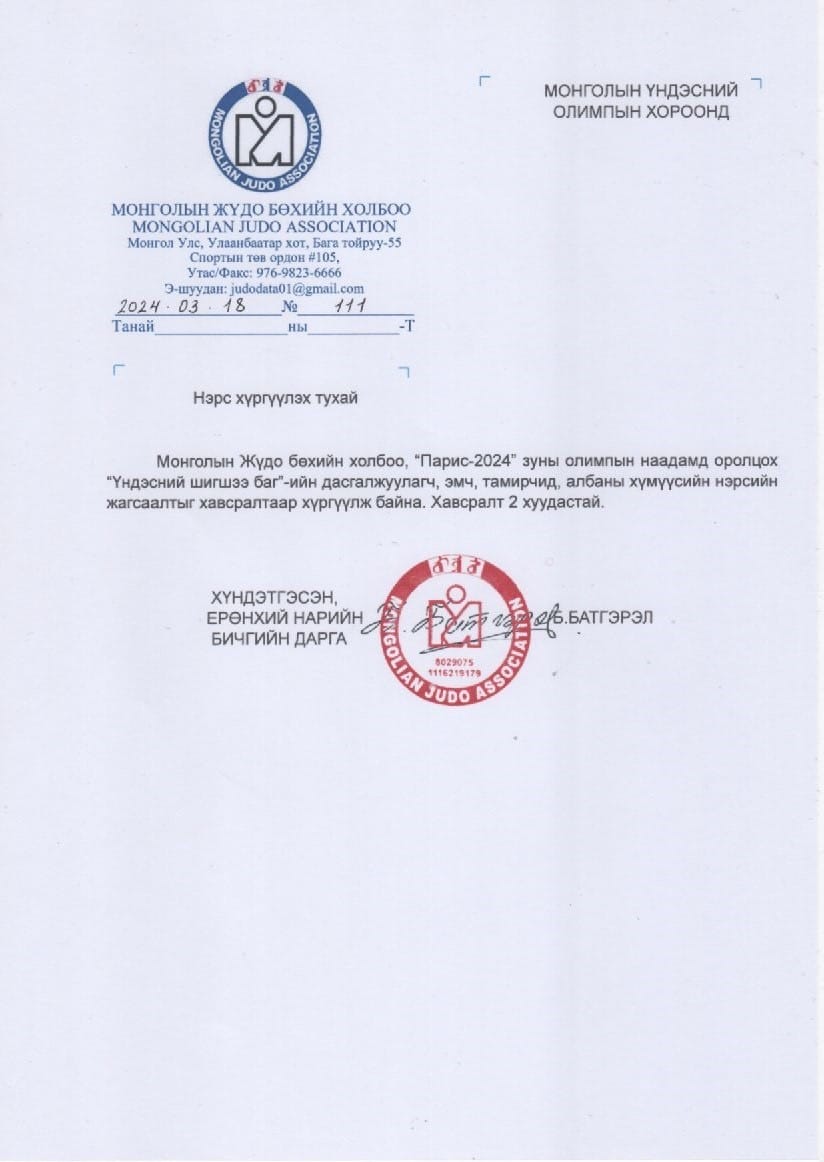 Жич: Засгийн газрын тохируулагч агентлаг Биеийн тамир, спортын улсын хороо, Спортын Анагаах ухаан, эрдэм шинжилгээний төв болон Монголын жүдо бөхийн холбооноос ирүүлсэн албан бичиг