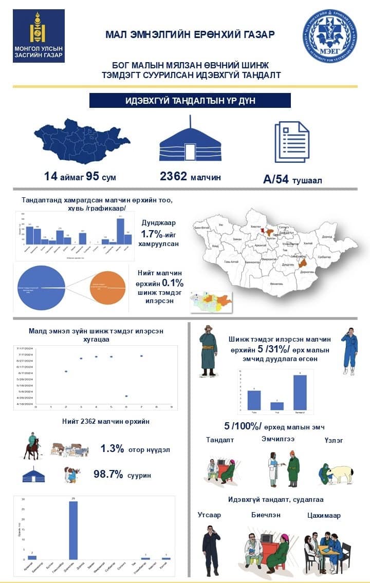 Мал эмнэлгийн ерөнхий газраас бог малын мялзан өвчнөөс урьдчилан сэргийлэх арга хэмжээг төлөвлөх, болзошгүй эрсдэлийг илрүүлэх, үнэлэх, халдварын тархалтыг магадлах зорилгоор эмнэл зүйн шинж тэмдэгт суурилсан идэвхгүй тандалтын судалгаанд эрсдэл бүхий төв болон зүүн бүсийн 14 аймаг, нийслэлийн 2362 малчин өрхийг хамруулан ажиллаа.