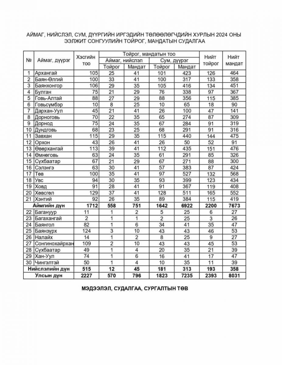 - Аймаг, нийслэл, сум, дүүргийн иргэдийн Төлөөлөгчдийн Хурлын 2024 оны ээлжит сонгуулийн саналын хуудасны нэгдсэн дугаар, тоо, загварыг тус тус батлав. Саналын хуудас нь Аймаг (нийслэл)-ийн иргэдийн Төлөөлөгчдийн Хурал болон Сум (дүүрэг)-ийн иргэдийн Төлөөлөгчдийн Хуралд сонгохыг хүссэн нэр дэвшигчийн өмнөх зууван дугуйг дүүргэн будаж, тэмдэглэх хэсэгтэй байх юм.
