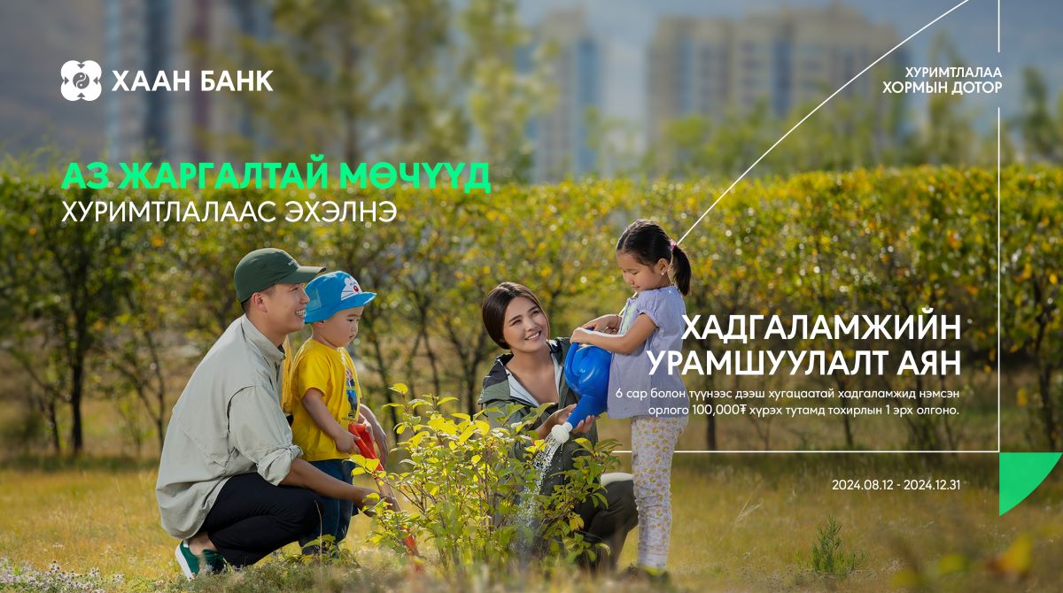 Ирээдүйнхээ төлөө хуримтлал үүсгэж буй харилцагчдадаа зориулан ХААН Банк 2024 оны 8-р сарын 12-ны өдрөөс 12-р сарын 31-ний өдрийг дуустал хугацаанд хуримтлуулах дадлыг тань дэмжсэн ээлжит урамшуулалт аянаа зарлалаа.