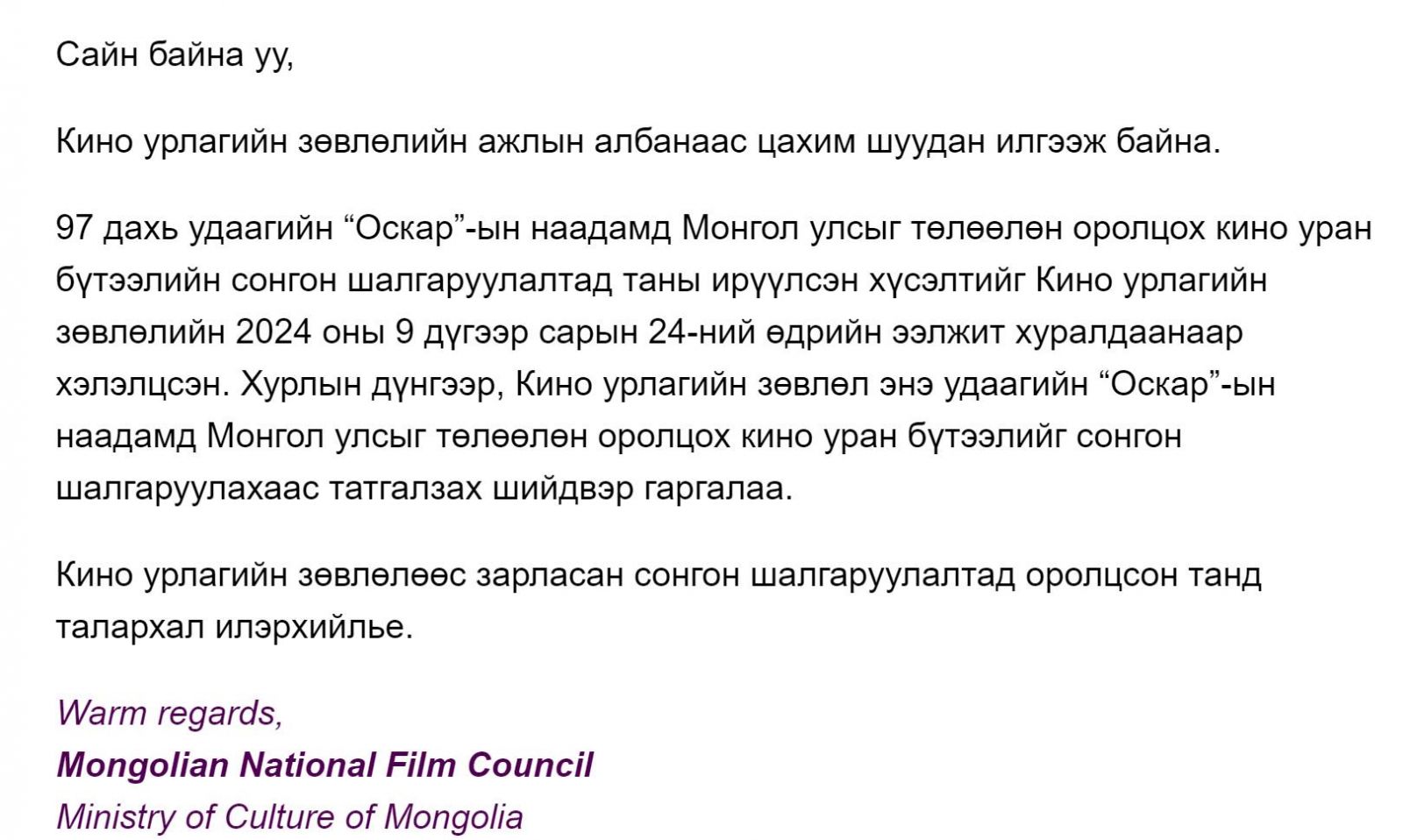 Монголын кино урлагийн зөвлөлийг жүжигчин Ч.Ундрал удирддаг. Түүний тэргүүлдэг байгууллагаас найруулагчийн хэлсэнчлэн дараах мэйлийг сонгон шалгаруулалтад оролцогчдодоо илгээжээ.