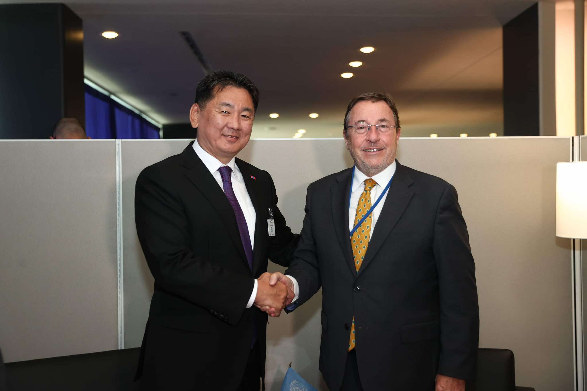 Монгол Улсын Ерөнхийлөгч Ухнаагийн Хүрэлсүх НҮБ-ын Ерөнхий Ассамблейн 79 дүгээр чуулганы Ерөнхий санал шүүмжлэлд оролцох үеэрээ НҮБ-ын Хөгжлийн хөтөлбөрийн захирагч Аким Штайнер-ийг 2024 оны 9 дүгээр сарын 25-ны өдөр хүлээн авч уулзав.