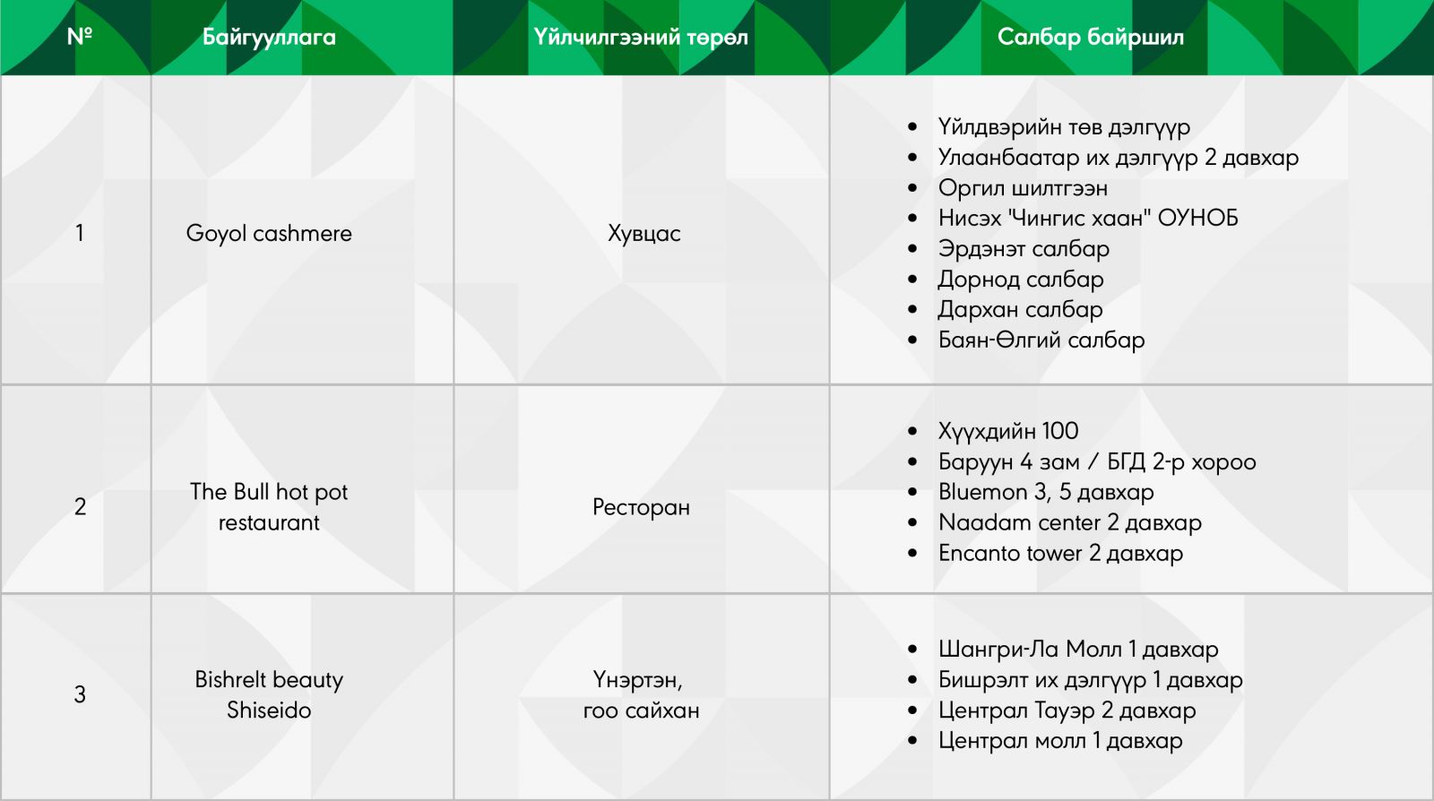 Та дээрх хоёр төрлийн кредит картаас өөрт тохирохоо сонгон 2024 оны 10-р сарыг дуустал шинээр захиалаад дараах байгууллагуудаар үйлчлүүлэхдээ 100,000 төгрөг болон түүнээс дээш дүнтэй эхний худалдан авалтдаа 50,000 төгрөгийн шууд хөнгөлөлт эдлэх боломжтойг дуулгахад таатай байна. Аяны туршид нэг харилцагчийн авах боломжтой хөнгөлөлтийн дээд хэмжээ 50,000 төгрөг байна.