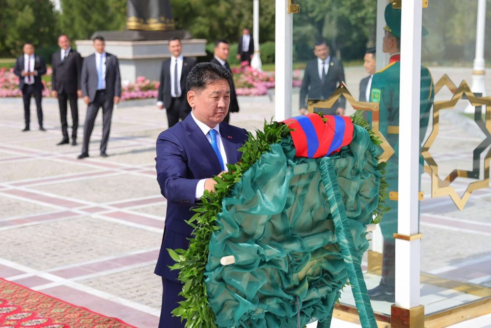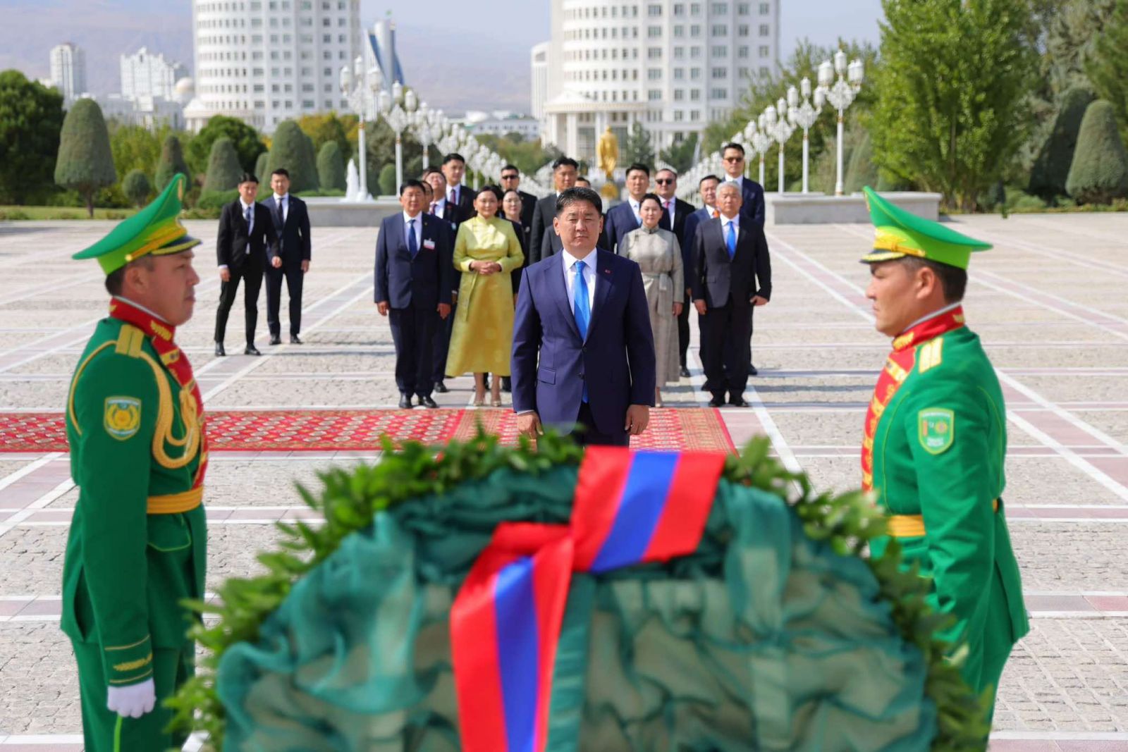 Ерөнхийлөгч Ухнаагийн Хүрэлсүх тэргүүтэй албаны төлөөлөгчид Туркменистаны “Тусгаар тогтнолын хөшөө”-нд хүндэтгэл үзүүлж, цэцэг өргөлөө.