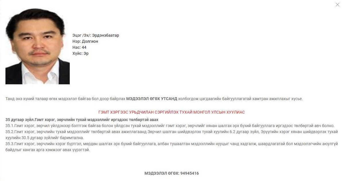 УИХ-ын гишүүн асан Ц.Цэрэнпунцагийн хүргэн, Блүүмберг телевизийн захирал Э.Долгионыг шүүхээс оршин суугаа хаягийг олж тогтоохыг Баянзүрх дүүргийн цагдаагийн газарт даалгасан байна.