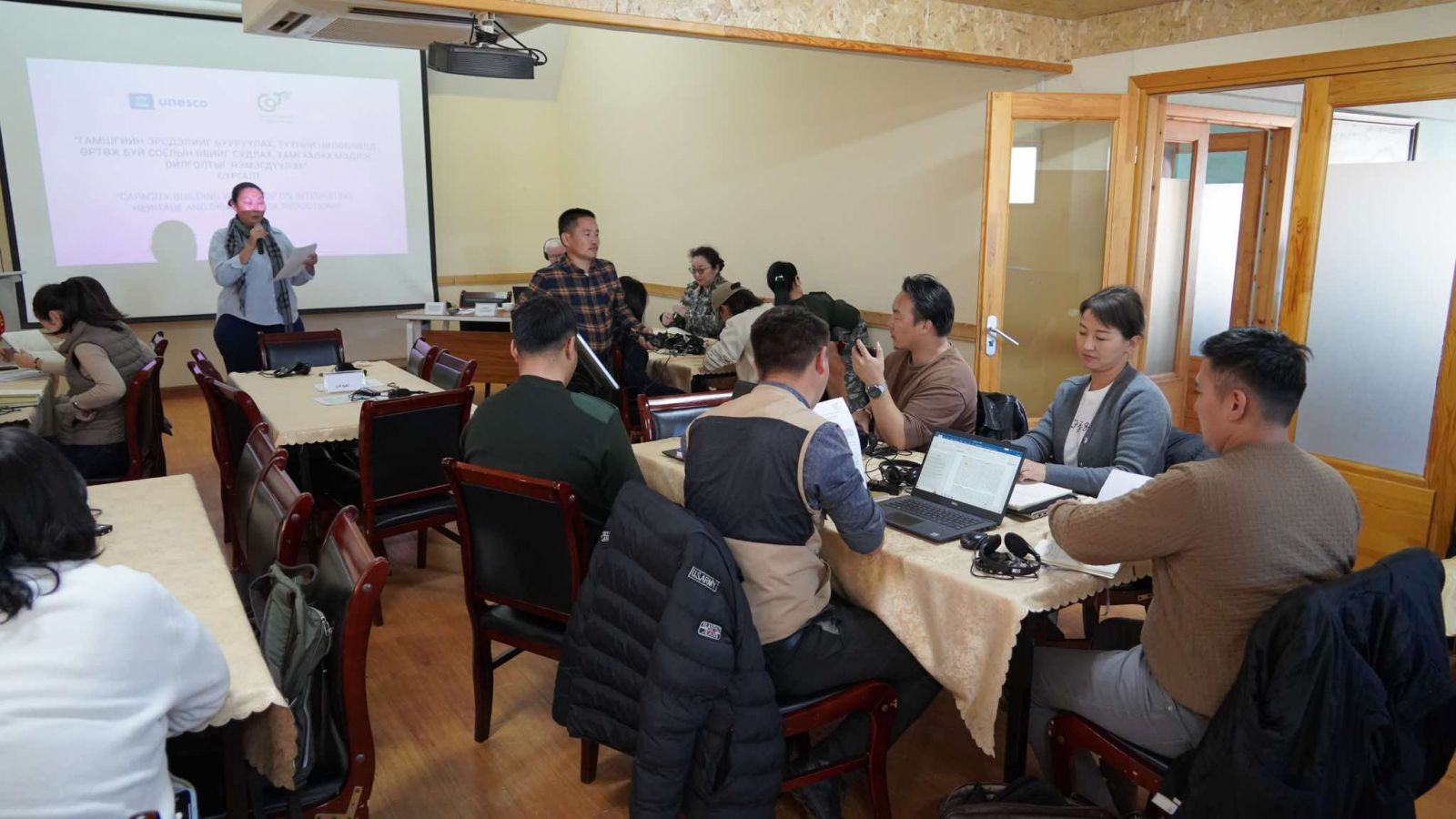 Сургалтад Соёл, спорт, аялал жуулчлал, залуучуудын яам, Байгаль орчин, уур амьсгалын өөрчлөлтийн яам, Засгийн газрын хэрэгжүүлэгч агентлаг Соёл урлагийн газар, Соёлын өвийн үндэсний төв, Гамшиг судлалын үндэсний хүрээлэн, Нүүдлийн соёл, иргэншлийг судлах Олон Улсын хүрээлэн, Соёл урлагийн их сургууль, Хөдөө аж ахуйн их сургууль Mongolian University of Life Sciences, ДӨ-Бурхан Халдун уул, түүнийг хүрээлсэн тахилгат газар нутгийн хамгаалалтын захиргаа, ДӨ-Орхоны хөндийн соёлын дурсгалт газрын хамгаалалтын захиргааны холбогдох мэргэжилтэн, албан хаагчид, 21 аймгийн Соёл урлаг, аялал жуулчлал, залуучуудын газрын мэргэжилтнүүд танхим болон цахимаар оролцож байна.