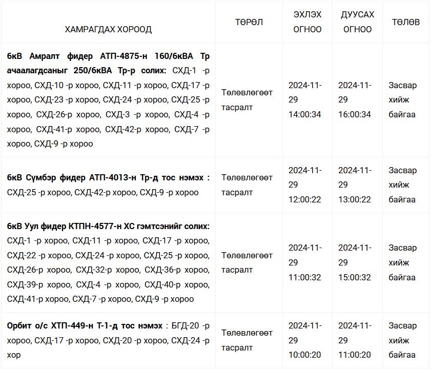 “Улаанбаатар цахилгаан түгээх станц” ТӨХК-иас цахилгаан шугам тоноглолд засвар, үйлчилгээ хийж буй билээ. Энэ хүрээнд өнөөдөр (2024.11.29) дараах дүүргийн зарим хороонд цахилгааныг тодорхой цагаар хязгаарлана.