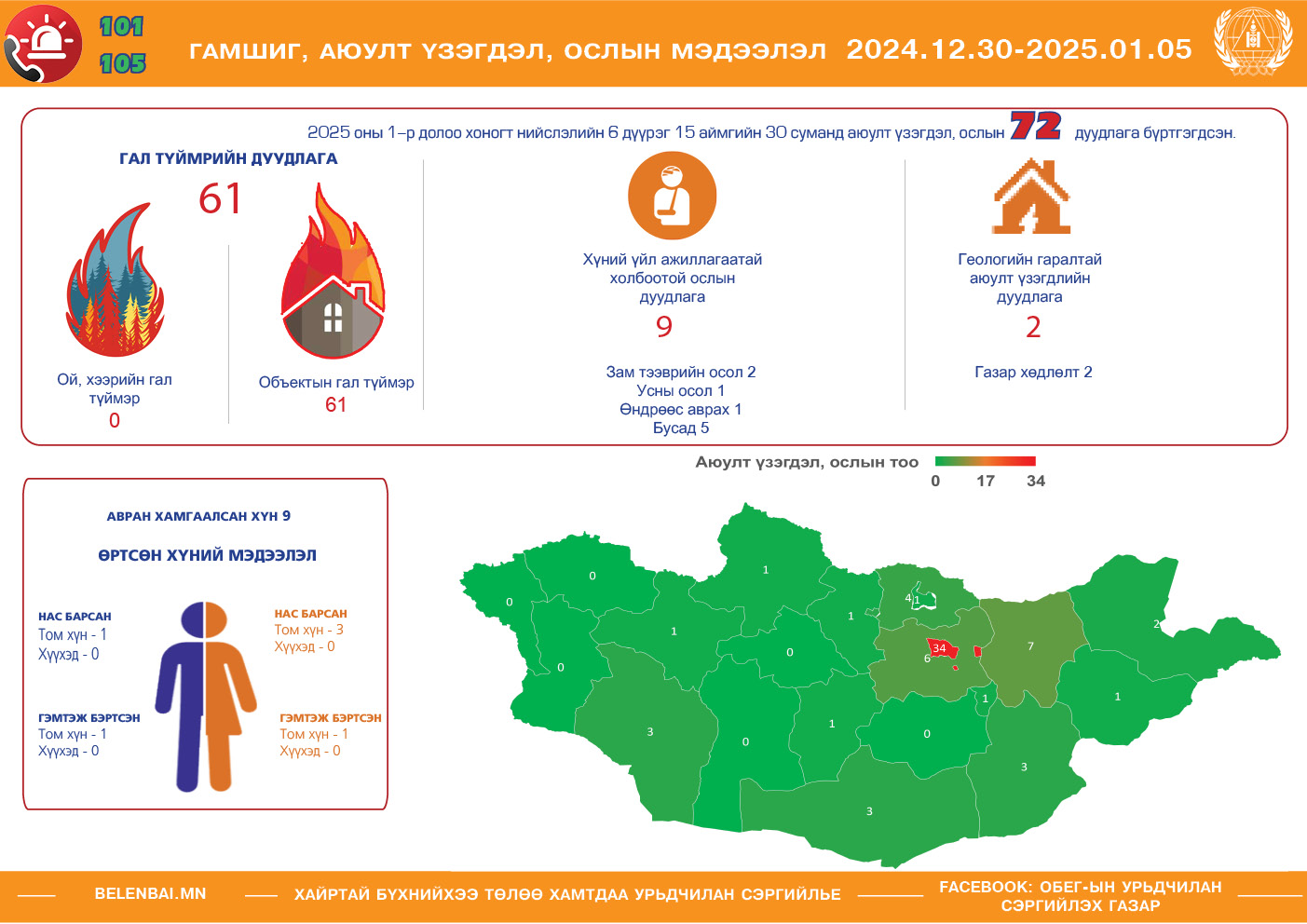 Нийт дуудлагын 61 нь гал түймэр, 9 нь хүний үйл ажиллагаатай холбоотой осол, хоёр нь геологийн гаралтай аюулт үзэгдэл, нэг нь биологийн гаралтай аюулт үзэгдэл байна.