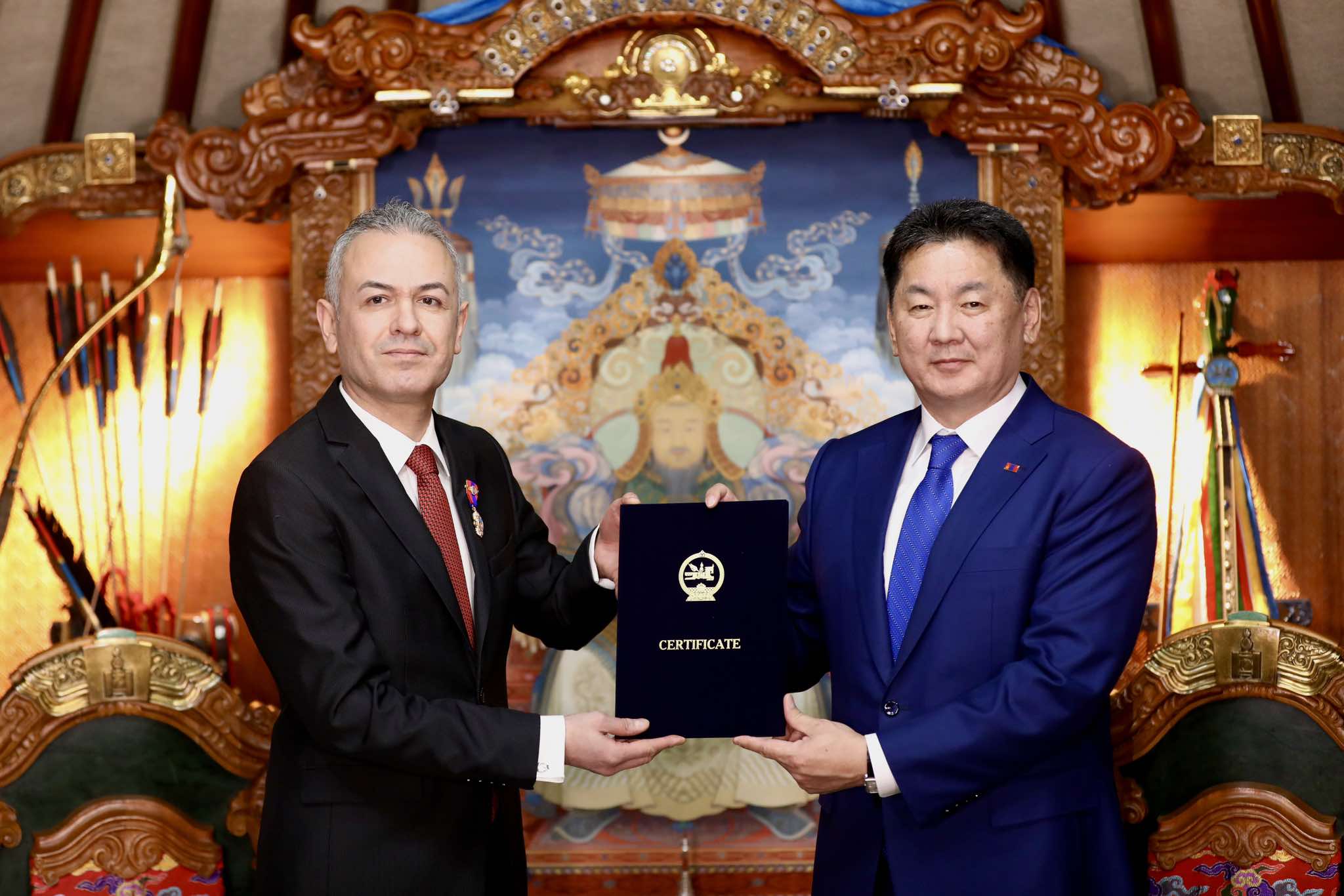 Мөн харилцаа, хамтын ажиллагааг улс төр, батлан хамгаалах, эдийн засаг, худалдаа, нийгэм, соёл, боловсрол, хүмүүнлэг зэрэг салбарт өргөжүүлэн хөгжүүлэх, хоёр орны ард түмний найрамдал, нөхөрлөлийг бэхжүүлэхэд оруулсан хувь нэмрийг нь үнэлж Элчин сайд Зафер Атешийг “Найрамдал” медалиар шагналаа.