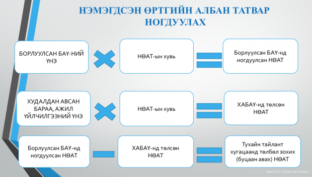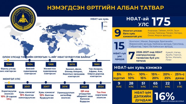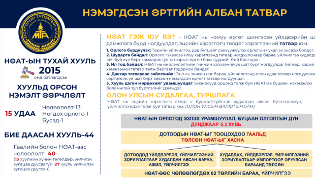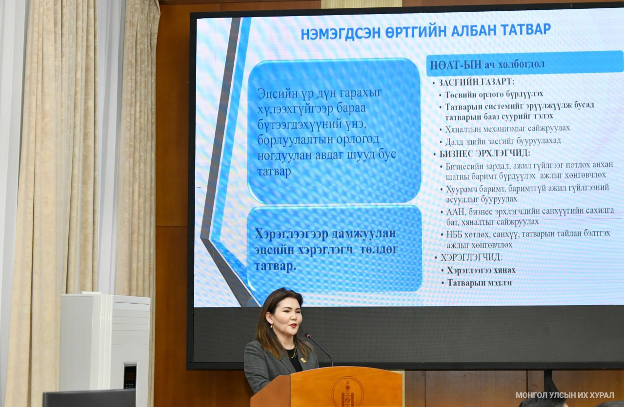Түүнчлэн дэлхийн 175 улс НӨАТ-ыг нэвтрүүлсэн бол Монгол Улс хамгийн бага хувь хэмжээтэй есөн улсын нэг гээд НӨАТ-ын тухай хуулийн хэрэгжилтийн талаар танилцуулав.