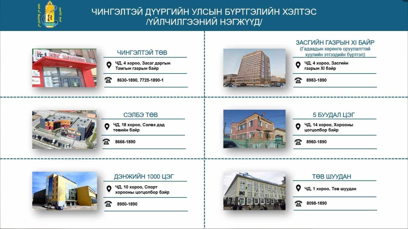 Чингэлтэй дүүргийн улсын бүртгэлийн хэлтэсийн зургаан цэгийн хаяг, байршил