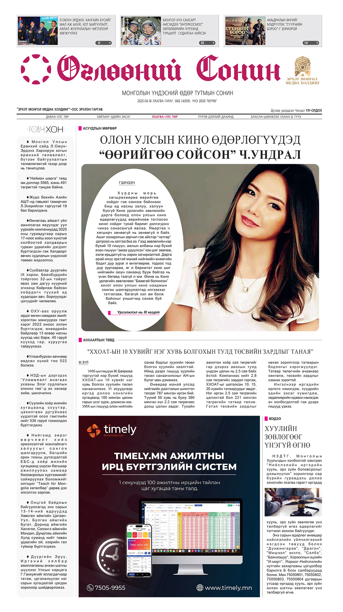 “Өглөөний сонин”-ы 2025.04.16-ны дугаарт “Олон улсын кино өдөрлөгүүдэд “өөрийгөө сойсон” Ч.Ундрал” асуудал хөндсөн өгүүлэл, “Монгол хүн сансарт нисэхдээ “Интеркосмос” хөтөлбөрийн хүрээнд туршилт судалгаа хийсэн тухай дурсамж, “Хангайн бүсийг төрөлжсөн мал аж ахуй, хот байгуулалт, аялал жуулчлалын чиглэлээр хөгжүүлнэ” гэсэн Засгийн газрын бодлого, Ерөнхий сайдын байр суурийг багтаалаа. Мөн далай тэнгисийн эрэг дээрх аралд усыг хэрхэн зарж, хөрөнгө босгож чадаж буй талаар Хятадын өмнөд хэсэг Хайнань арлын гайхамшгийн тухай “Олон өнгө” булангаас уншаарай.