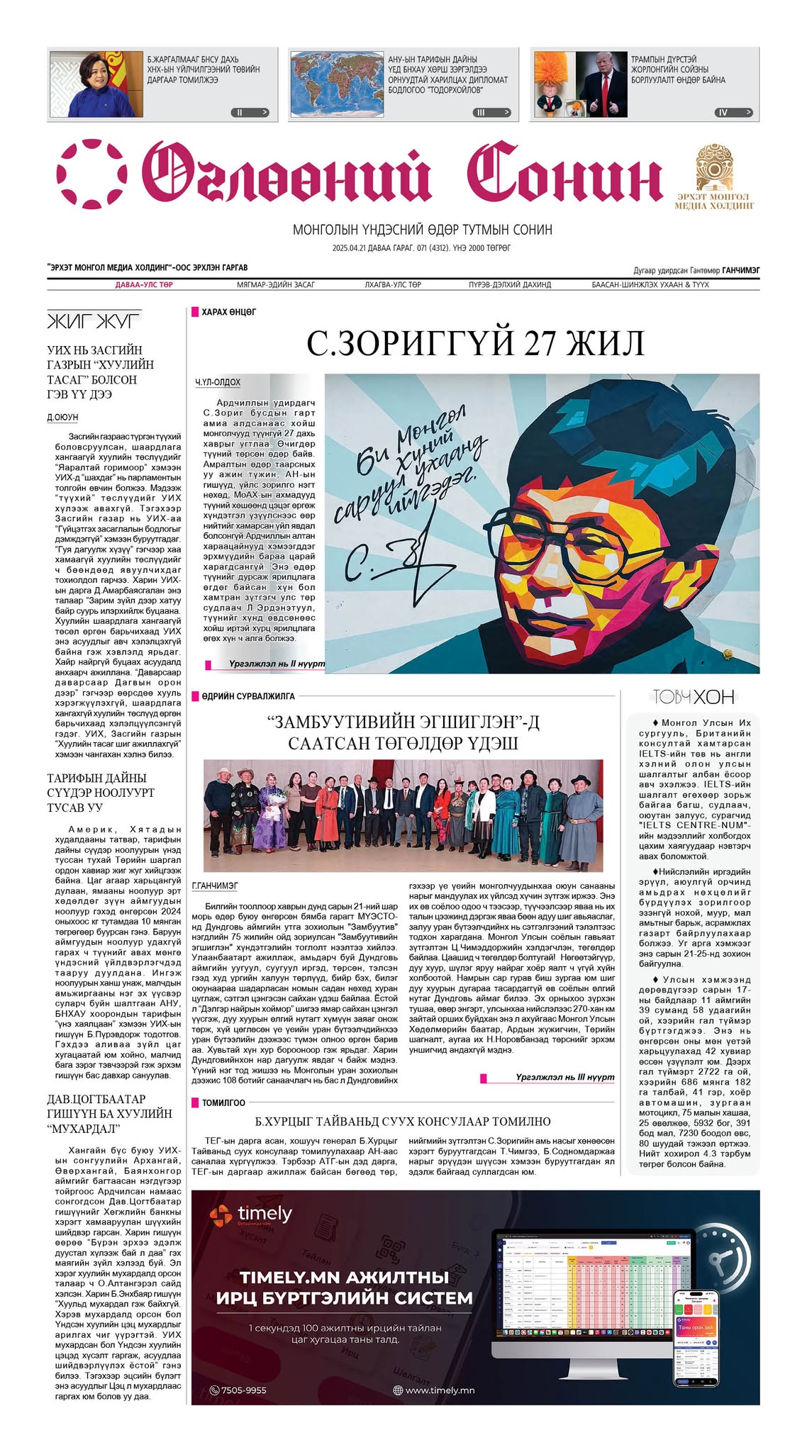 "Өглөөний сонин"-ы өнөөдрийн дугаараас "С.Зориггүй 27 жил" нийтлэл, ""Замбуутивийн эгшиглэн"-д саатсан төгөлдөр үдэш" өдрийн сурвалжилга, "АНУ-ын тарифын дайны үед БНХАУ хөрш зэргэлдээ орнуудтай харилцах дипломат бодлогоо "тодорхойлов" судлаачийн нийтлэлийг сонирхон уншаарай.