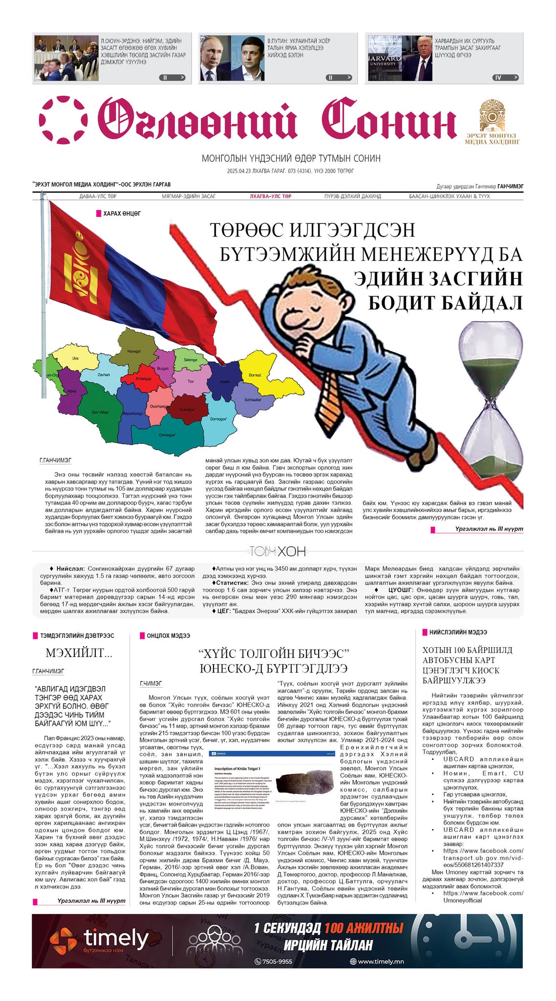 Үүний зэрэгцээ "Хүйс толгойн бичээс" ЮНЕСКО-д бүртгэгдлээ", "БНСУ монгол иргэдийн визний асуудлыг эргэж харна гэв", "Харвардын их сургууль Трампын засаг захиргааг шүүхэд өгчээ", "В.Путин: Украинтай хоёр талын яриа хэлэлцээ хийхэд бэлэн", Улаанбаатар "Хотын 100 байршилд автобусны карт цэнэглэх киоск байршуулжээ", "Говийн бүсийн төрийн албан хаагчдын зөвлөгөөн боллоо" зэрэг гадаад, дотоодод өрнөж нийгэм, улс төрийн мэдээ мэдээллийг хүлээн авах болно.