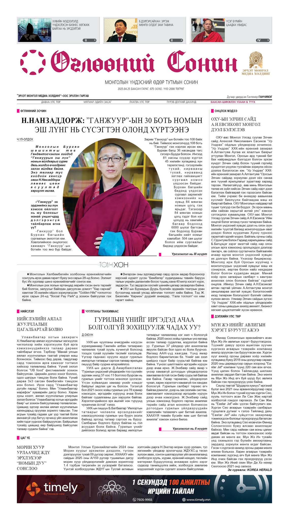 “Өглөөний сонин”-ы өнөөдөр/2025.04.25/-ийн дугаарын “Өглөөний зочин”-оор Монголын Бурхан шашинтны төв Гандантэгчэнлин хийдийн хансүр гавж Н.Нанзаддорж уригджээ. Эрхэм ламбугайн ““Ганжуур”-ын 30 боть номын эш лүнг сүсэгтэн олонд хүртээнэ” ярилцлагыг таны таалалд хүргэж байна.