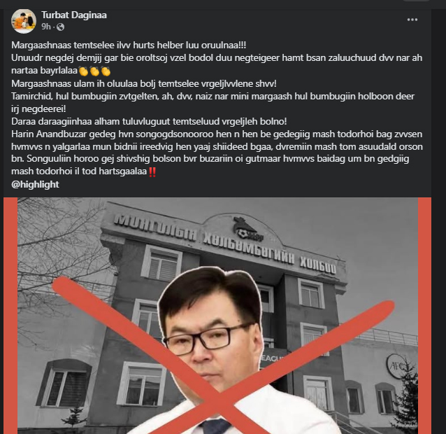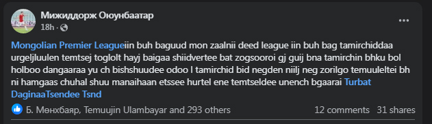 “Монголын Үндэсний шигшээ багийн бүх цаг үеийн мэргэн бууч Н.Наранболд миний бие өнөөдрийн Хөлбөмбөгийн Холбооны Ерөнхийлөгчийн хууль бус, худалдагдсан сонгуулийн дүнг хүлээн зөвшөөрөхгүй байх тул цаашид болох Лигийн тоглолтод оролцохгүй гэдгээ үүгээр илэрхийлж байна. Тамирчидаа зорилгодоо үнэнч, эхлүүлсэн ажилдаа тууштай байхыг хүсэж байна” хэмээн фэйсбүүк хаягтаа бичжээ.