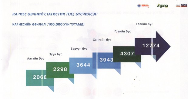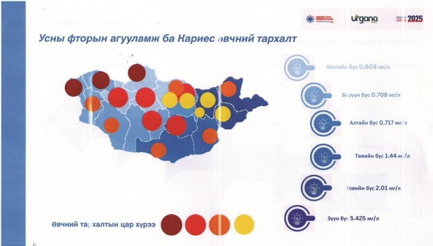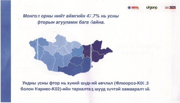 -Шүдний өвчин нь дэлхий дахинд төдийгүй манай улсын хувьд тулгамдаж буй асуудлуудын нэг болоод байна. Сургуулийн өмнөх насны болон сургуулийн насны хүүхдүүдийн дунд хийсэн судалгаагаар шүд цоорох өвчний тархалт 86-94 хувьтай байна. Өөрөөр хэлбэл, 10 хүүхэд тутмын 8-9 нь шүд цоорох өвчтэй гэсэн үг. Эцэг эх, асран хамгаалагчдын хувьд хүүхдийнхээ сүүн шүдэнд ихээхэн ач холбогдол өгч, хүүхдээ эрүүл саруул өсгөх ёстой. Гэвч бодит байдал дээр “Сүүн шүд уначих юм чинь...” гэсэн хандлага ажиглагддаг. Тэгвэл Япон улсад хийсэн судалгаагаар сүүн шүд нь өвчлөлтэй бол 92 хувьд байнгын шүд нь мөн адил өвчлөлтэй байдаг гэдгийг тогтооожээ. Тиймээс таны хүүхдийн сүүн шүд эрүүл байснаар байнгын шүд нь 86 хувьтай эрүүл байна. “Өвчин хэлж ирдэггүй” гэж ярьдаг ч шүдний өвчин хэлж ирдэг юм шүү. Жишээлбэл, цагаан өнгөтэй шүд өнгөө хувиргаж, хар өнгөтэй болдог, дараа нь өвдөж зовуурилдаг. Шүд цоорох өвчин үүсэж байгаа нь энэ. Тэгвэл шүд цоорох өвчнөөс 100 хувь урьдчилан сэргийлж, уг өвчлөлийг үүсгэж байгаа хүчин зүйлсийг хянах боломжтой. Түүнчлэн Монгол орны нийт аймгийн 47.7 хувь нь усны фторын агууламж багатай байна. Энэхүү ундны усны фтор нь хүний шүдний өвчлөл (Флюозор-К00.3 болон Кариес-К02)-ийн тархалтад хүчтэй хамааралтай байна. Үүнийг зохицуулж, урьдчилан сэргийлэх боломжийг өнөөдөр бид хамтран эрэлхийлж байгаа төдийгүй энэ нь боломжтой зүйл юм.