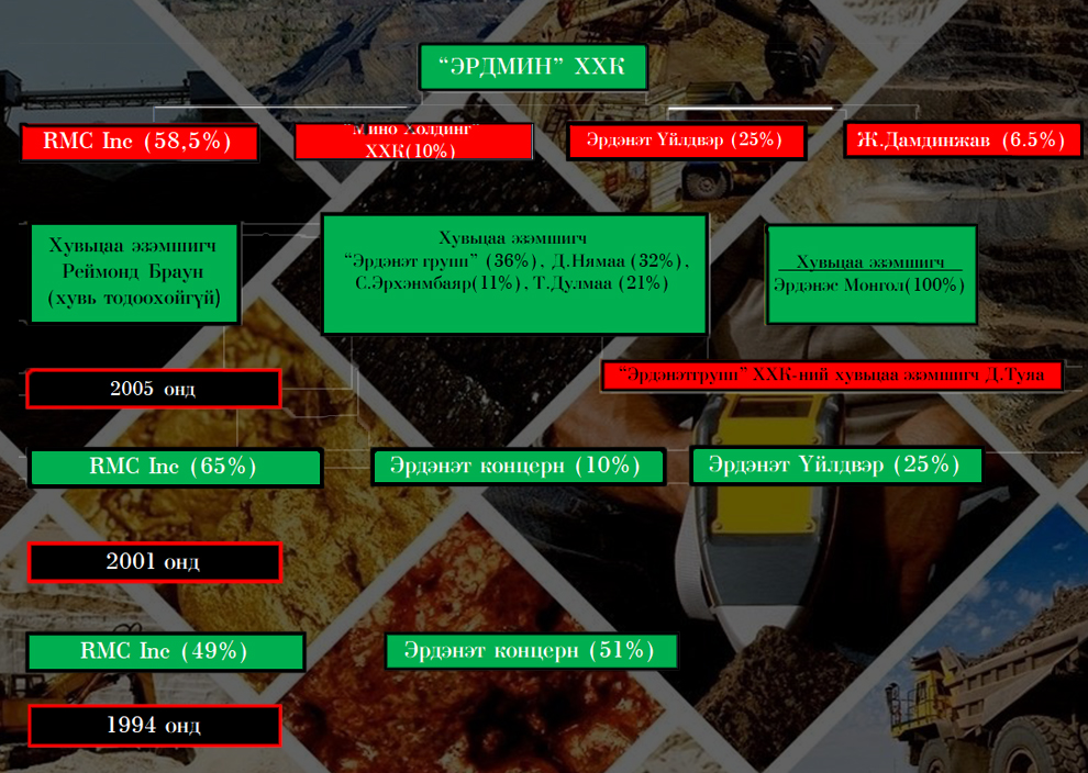 Сонирхуулахад, "Эрдмин" ХХК-ийг гадаадын хөрөнгө оруулалттай гэдэг боловч үнэндээ 20 гаруй хувийг тухайн үеийн "Эрдэнэт" үйлдвэрийн удирдлагуудын гэр бүл хамаатан садан эзэмшиж байна. Тодруулбал, “Эрдмин” ХХК байгуулагдах үед Эрдэнэт үйлдвэрийн ерөнхий захирал асан Ш.Отгонбилэг агсан, Монгол Улсын Ерөнхийлөгчөөр Н.Багабанди нартай холбогддог.