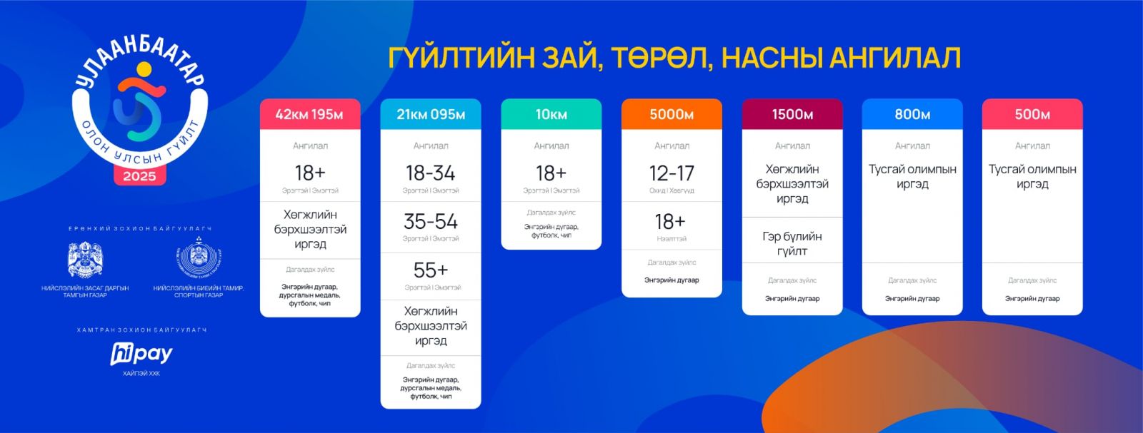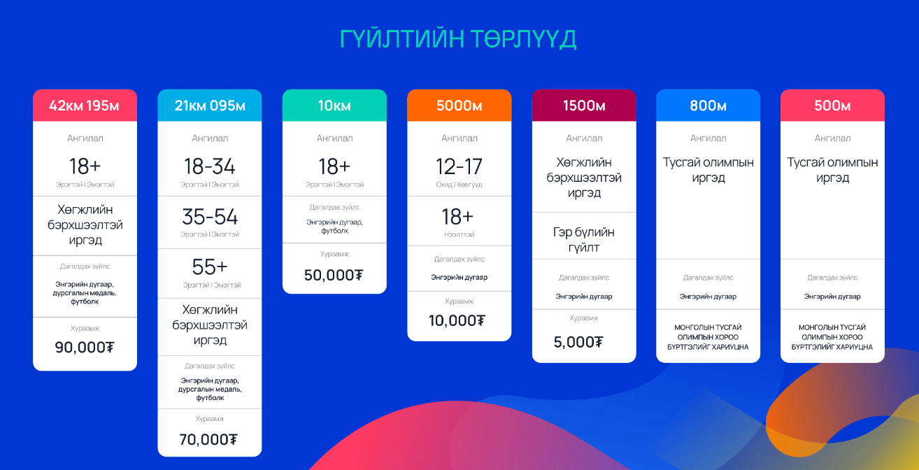 Тэгвэл 42 км 195 метрийн бүтэн марафон 18-аас дээш насныхан ба хөгжлийн бэрхшээлтэй иргэд гэсэн хоёр ангилалтай. Одоогоор 135 хүн гүйхээр бүртгүүлжээ. Марафонд оролцогчид тодорхой хураамж төлөх учиртай. Хураамжийн хэмжээ гүйлтийн зайнаас шалтгаалаад 5000-90 000 төгрөг байна. Мөн 500, 800 метрийн тусгай гүйлт гэж бий. Энэ зайд гүйх хүмүүс хураамж төлөхгүй байж болох юм.