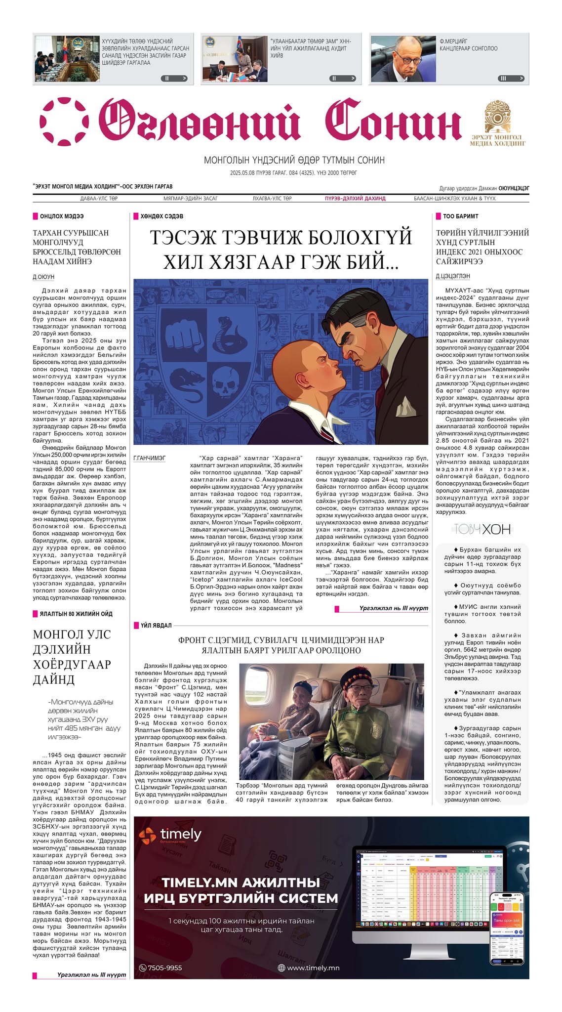 Монголчууд сошиалд гарсан сураг төдийгөөр таних танихгүй хэн нэгнийг буруутган чичилж, ялгаварлан гадуурхах байдал газар авсан. Үүнээс болж ноцтой ямар үр дагавар үүсэж буйг уг нийтлэлд тусгасан юм. Дэлхий даяар тархан суурьшсан монголчууд зургаадугаар сарын 28-нд Бельгийн Брюссель хотод төвлөрсөн наадам хийхээр болсон, зургаадугаар сарын 1-нээс зарим төрлийн хүнсний ногоонд урамшуулал олгохоор шийдвэрлэсэн, ураны хайгуул, олборлолтыг хянах иргэдийн хяналтын зөвлөл байгуулахаар Засгийн газраас хэлэлцсэн зэрэг мэдээ мэдээлэл болон Ялалтын 80 жилийн ойд зориулсан буланд Дэлхийн хоёрдугаар дайнд монголчууд ямар оролцоотой байсан талаарх нийтлэлийг багтаалаа. Мөн Пулитцерийн шагналын эзэд тодорсон, ХБНГУ-ын Канцлераар Ф.Мерцийг сонгосон зэрэг гадаад мэдээ, валютын ханш, зурхай зэргийг сонирхоорой.