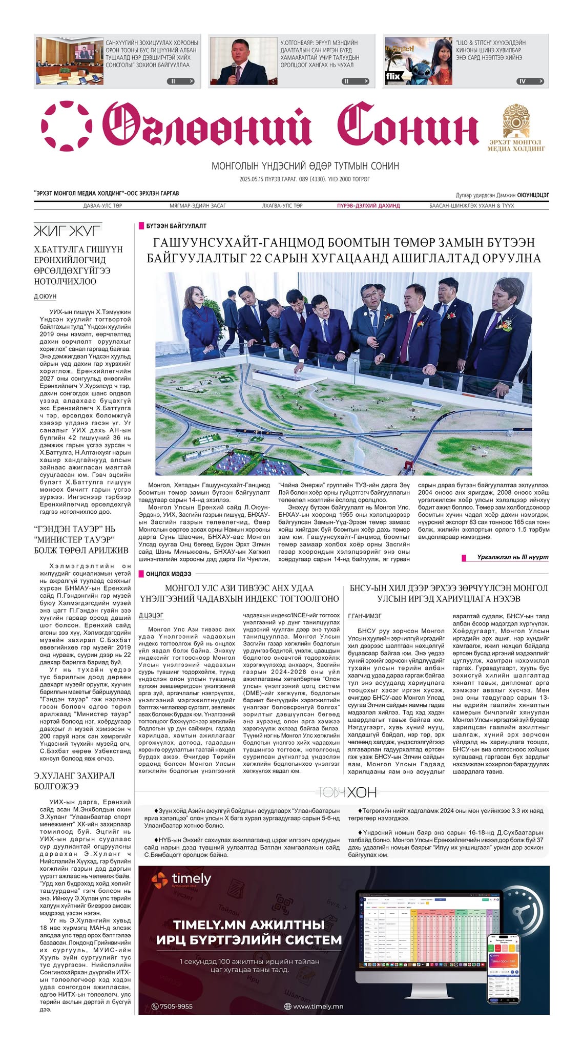 “Өглөөний сонин”-ы 2025 оны 5 дугаар сарын 15-ны шинэ дугаар уншигчдын гарт хүрлээ. Өнөөдрийн дугаарт Монгол, Хятадын хил дээрх Гашуунсухайт-Ганцмод боомтын төмөр замын бүтээн байгуулалтын нээлтийн үйл ажиллагааг онцоллоо. Энэхүү бүтээн байгуулалт нь Монгол Улс, БНХАУ-ын хооронд 1955 оны хэлэлцээрээр байгуулсан Замын-Үүд-Эрээн төмөр замаас хойш хийгдэж буй боомтын хоёр дахь төмөр зам гэдгээрээ онцлог юм. Төмөр зам холбогдсоноор боомтын хүчин чадал хоёр дахин нэмэгдэж, нүүрсний экспорт 83 сая тонноос 165 сая тонн болж, жилийн экспортын орлого 1.5 тэрбум ам.доллараар нэмэгдэнэ.