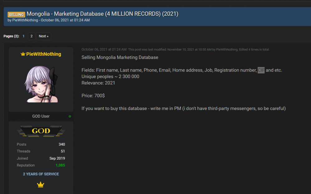 Сануулахад, одоогоос дөрвөн жилийн өмнө буюу 2021 оны арваннэгдүгээр сард Монгол Улсын 2,3 сая иргэний 4 сая орчим мэдээллийг 700 ам.долларын үнэтэйгээр худалдаалж байна гэх зар raidforums.com гэх хакеруудын сайтад байршиж байсан бөгөөд үүнд иргэний овог нэр, утасны дугаар, и-мэйл хаяг, гэрийн хаяг, ажил, регистрийн дугаар, банкны хэрэглэгчийн болон бусад мэдээллүүд багтсан байсан юм.
