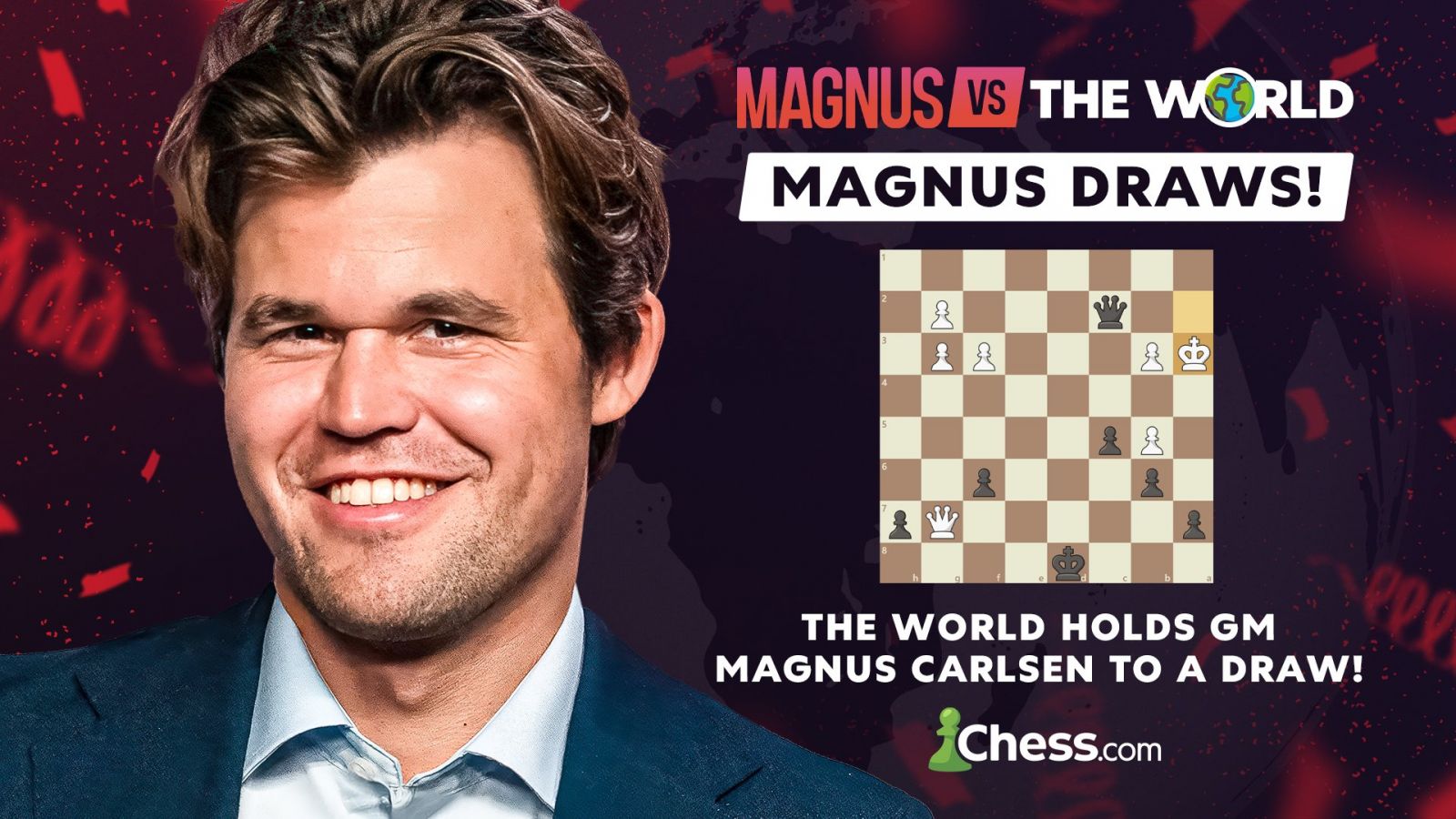 Дэлхийн чансааг тэргүүлэгч, эдүгээ цагийн Шатрын ноён оргил, Норвегийн их мастер Магнус Карлсен дөрөвдүгээр сарын 4-нөөс хойш 46 хоногийн хугацаанд 143 000 шатарт сонирхолтой хүмүүсээс бүрдсэн The World-той онлайнаар тоглож, тэнцлээ. The World-ийнхон гурван дараалан нэг байрлалаар шалснаар 32 дахь нүүдэлд тэнцэх болзлоо хангасан юм.
