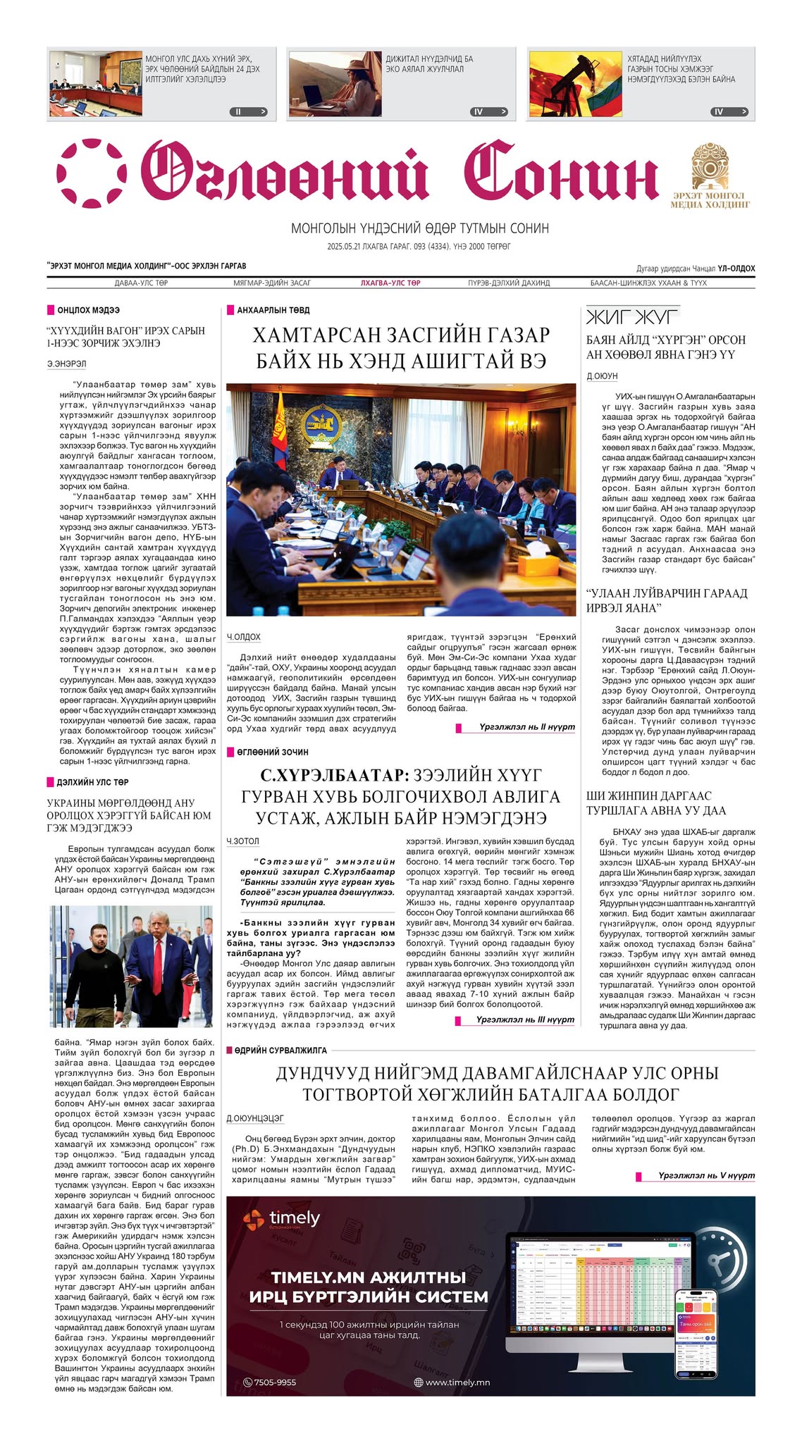 Өнөөдрийн дугаарт Монголын улс төр, нийгэмд үүсээд буй цаг үеийн асуудлаар “Хамтарсан Засгийн газар байх нь хэнд ашигтай вэ” тойм нийтлэл, “Сэтгэшгүй” эмнэлгийн захирал С.Хүрэлбаатарын “Зээлийн хүүг гурван хувь болгочихвол авлига устаж, ажлын байр нэмэгдэнэ” гэсэн ярилцлага, Онц бөгөөд Бүрэн Эрхт элчин, доктор Б.Энхмандахын “Дундчуудын нийгэм, Умардын хөгжлийн загвар” ном нээх ёслолын сурвалжилга, дэлхийн мэдээний нүүрээс “Дижитал нүүдэлчид ба эко аялал жуулчлал” зэрэг сонирхол татсан материалуудыг уншаарай.