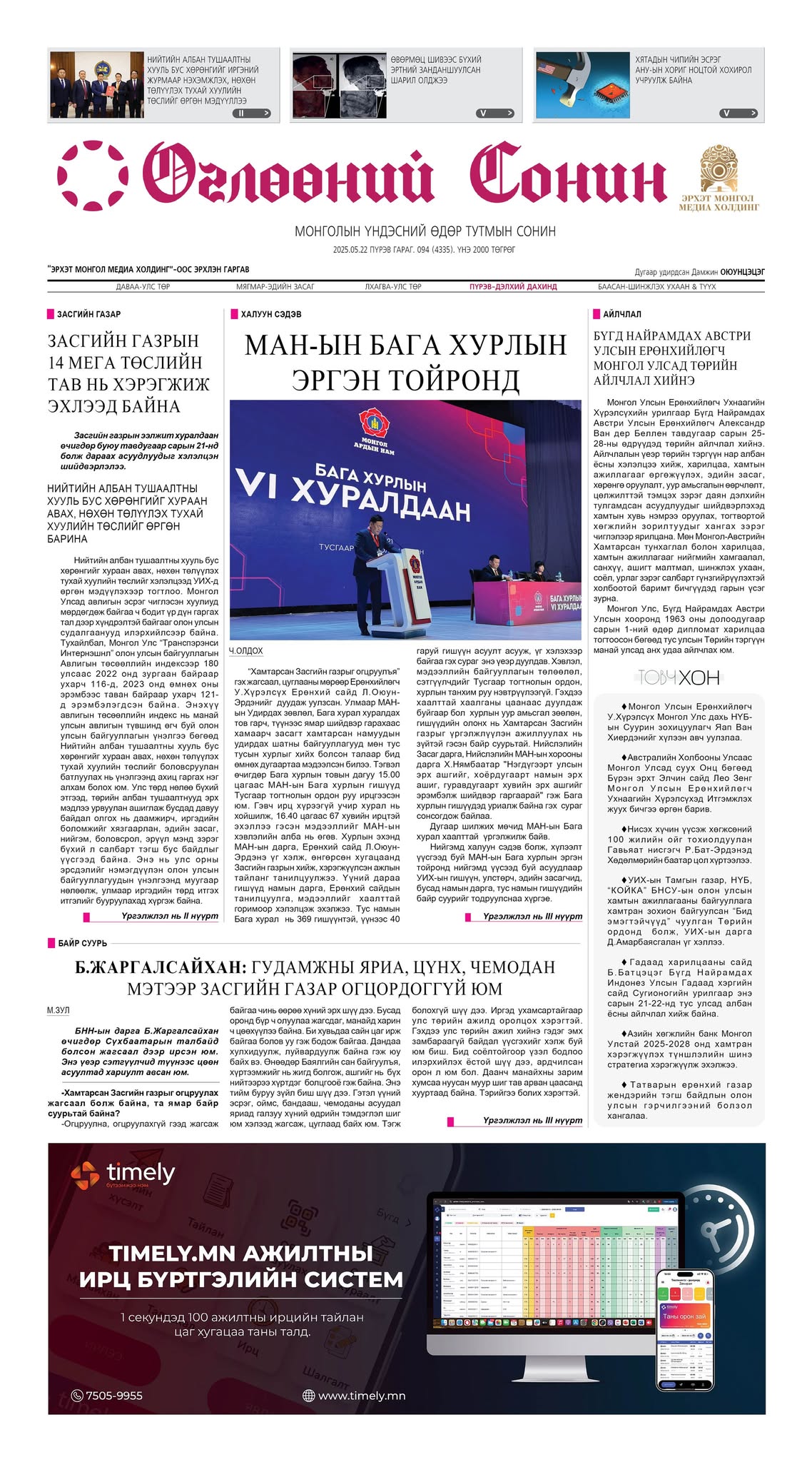 Сонины тойм “Өглөөний сонин”-ы 2025 оны тавдугаар сарын 22-ны дугаар уншигчдад хүрлээ.