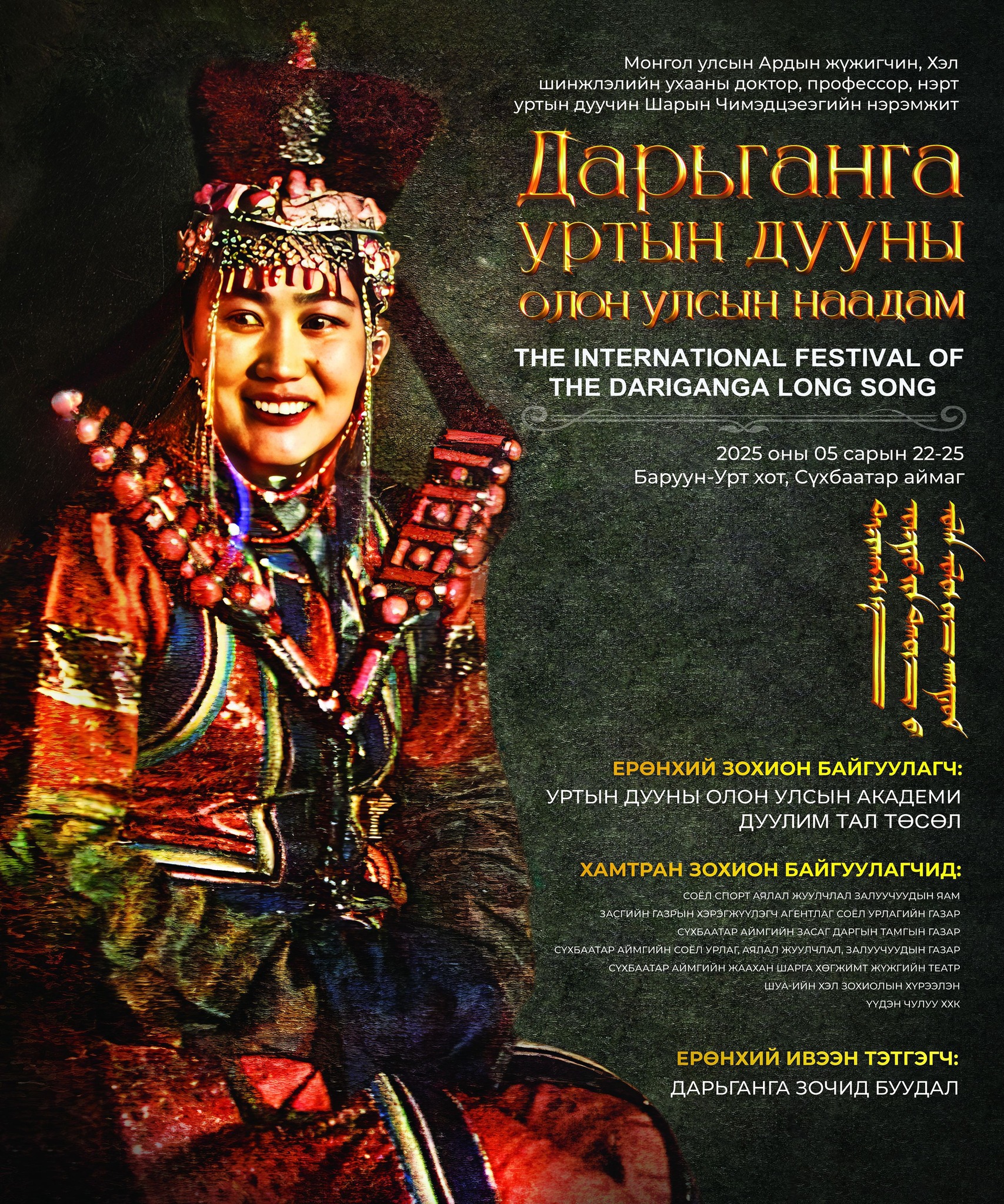 Монгол Улсын Ардын жүжигчин, Хэл шинжлэлийн ухааны доктор, профессор, нэрт уртын дуучин Ш.Чимэдцэеэгийн нэрэмжит дарьганга уртын дууны Олон улсын наадам Сүхбаатар аймгийн Баруун-Урт хотын төвд пүрэв гаригт (2025.05.22) эхэллээ.