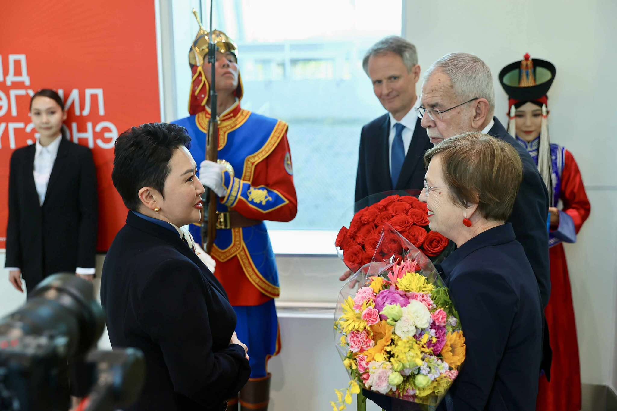 Ерөнхийлөгч Александр Ван дер Беллен, гэргий Дорис Шмидауэр болон дагалдан яваа төлөөлөгчдийг “Чингис Хаан” олон улсын нисэх онгоцны буудалд Гадаад харилцааны сайд Б.Батцэцэг, Бүгд Найрамдах Австри Улсаас Монгол Улсад хавсран суугаа Онц бөгөөд Бүрэн эрхт Элчин сайд Андреас Рийкен болон албаны бусад хүмүүс угтлаа.