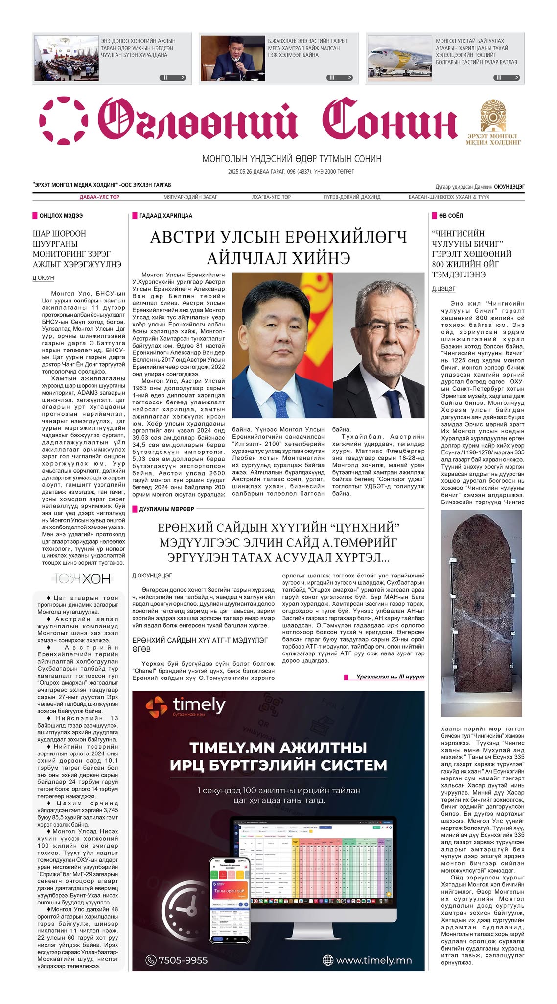 Өнөөдрийн дугаарт улс төрийн хүрээнд өрнөсөн дуулиан шуугиантай долоо хоногийн төгсгөлд зарим үйл явдалд цэг тавьсан, зарим хэргийн ээдрээ хаашаа эргэсэн талаар, ямар ямар үйл явдал болж өнгөрсөн тухай “Ерөнхий сайдын хүүгийн “цүнхний” мэдүүлгээс Элчин сайд А.Төмөрийг эргүүлэн татах асуудал хүртэл...” гарчгийн дор багцлан хүргэлээ. Алдарт “Чингисийн чулууны бичиг” гэрэлт хөшөөний 800 жилийн ой энэ онд тохиож байгаа, энэ долоо хоногийн ажлын таван өдөр УИХ-ын нэгдсэн чуулган бүтэн хуралдахаар болсон, НҮБ-ын цөлжилттэй тэмцэх тухай конвенцын талуудын 17 дугаар бага хурлыг Монгол Улс 2026 онд зохион байгуулах гэж буй, Монгол Улстай байгуулах агаарын харилцааны тухай хэлэлцээрийн төслийг Болгарын Засгийн газар баталсан, "Огцрох амархан" жагсаалд оролцож байгаа Ц.Лут-Очирын биед халдсан хэргийг цагдаа шалгаж байгаа зэрэг мэдээ мэдээллийг багтаалаа. Хамтарсан Засгийн газрын үйл ажиллагааны талаар Сангийн сайд Б.Жавхлан, Гадаад харилцааны сайд Б.Батцэцэг нар юу хэлснийг сонирхоорой.