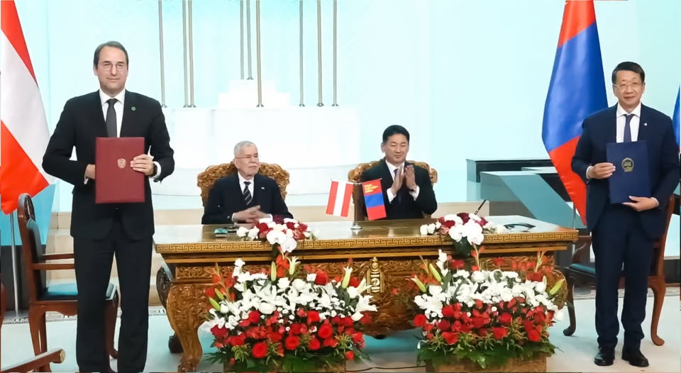 Айлчлалын хүрээнд өнөөдөр /2025.05.26/ “Нийгмийн хамгааллын тухай Монгол Улс болон Бүгд Найрамдах Австри Улс хоорондын хэлэлцээр”-т Монгол Улсын Гэр бүл, хөдөлмөр, нийгмийн хамгааллын сайд Л.Энх-Амгалан, Бүгд Найрамдах Австри Улсын Европ, олон улсын харилцааны яамны Ерөнхий нарийн бичгийн дарга Николаус Маршик нар гарын үсэг зурлаа.