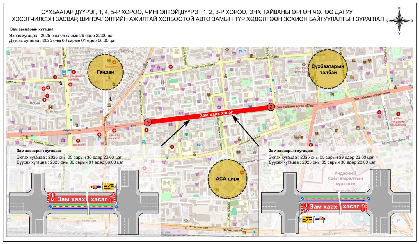 Сүхбаатар дүүргийн 1, 4, 5 дугаар хороо, Чингэлтэй дүүргийн 1, 2, 3 дугаар хороо, Энхтайваны өргөн чөлөөний засвар, шинэчлэлтийн ажлын хүрээнд 11 дүгээр сургуулийн уулзвараас Цэцэг төвийн уулзвар хүртэлх авто замыг хэсэгчлэн хааж, шинэчилнэ.