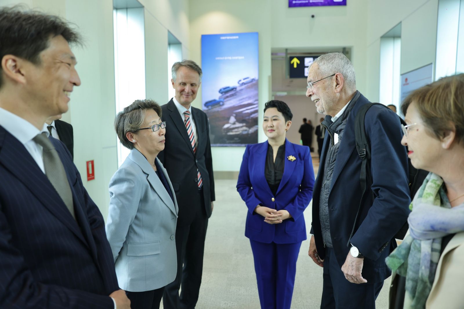 Бүгд Найрамдах Австри Улсын Ерөнхийлөгч Александр Ван дер Белленийг “Чингис хаан” олон улсын нисэх онгоцны буудалд Гадаад харилцааны сайд Б.Батцэцэг, Бүгд Найрамдах Австри Улсаас Монгол Улсад хавсран суугаа Онц бөгөөд Бүрэн эрхт Элчин сайд Андреас Рийкен болон албаны бусад төлөөлөгч үдлээ.