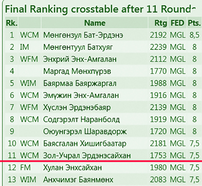 Эмэгтэйчүүдээс форм маш сайтай байгаа Б.Мөнгөнзул 8.5 оноотойгоор тэргүүлж, их мастер Б.Мөнгөнтуул нарын зэрэг 8 шатарчин адил 8 оноотойгоор ард нь бичигдлээ. Эхний 11-д орсон шатарчид дээр ноднингийн улсын аварга, их мастер Т.Мөнхзул нэмэгдсэнээр шигшээ тэмцээнд оролцох тамирчид бүрдэж байна.