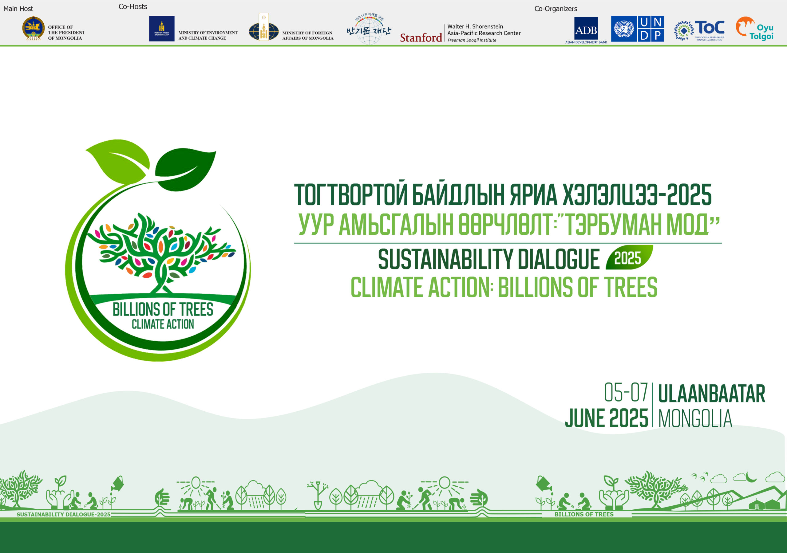 Монгол Улсын Ерөнхийлөгчийн ивээл дор “Тогтвортой байдлын яриа хэлэлцээ 2025 – Уур амьсгалын өөрчлөлт: Тэрбуман мод” чуулга уулзалт 2025 оны зургаадугаар сарын 05-07-ны өдрүүдэд Төрийн ордонд болно.
