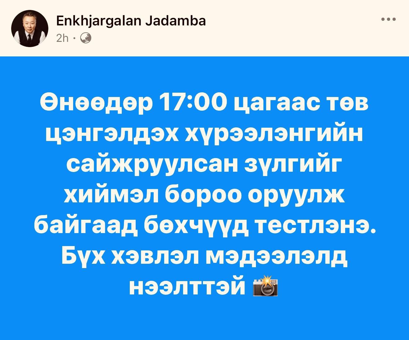 “Өнөөдөр 17:00 цагаас Төв цэнгэлдэх хүрээлэнгийн сайжруулсан зүлгийг хиймэл бороо оруулж байгаад бөхчүүд тестлэнэ. Бүх хэвлэл мэдээлэлд нээлттэй” гэж Ж.Энхжаргалан сошиал хаягтаа пост оруулжээ.