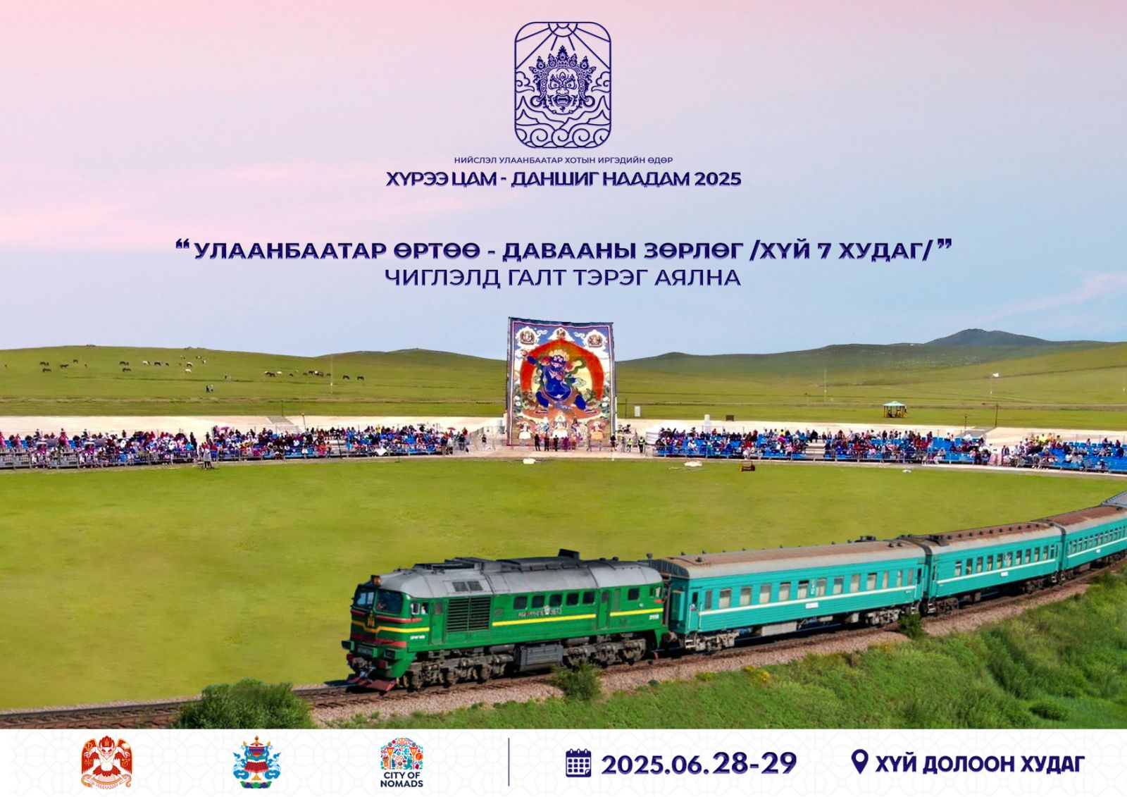Нийслэл Улаанбаатар хотын иргэдийн өдөр “Хүрээ цам-Даншиг наадам 2025” энэ амралтын өдрүүдэд буюу зургаадугаар сарын 28, 29-ний өдрүүдэд Хүй долоон худагт болно. Наадамчин олондоо зориулж Улаанбаатар өртөөнөөс Давааны зөрлөг /Хүй 7 худаг/ хүртэл өдөрт гурван удаагийн давтамжтайгаар галт тэрэг аялуулна.
