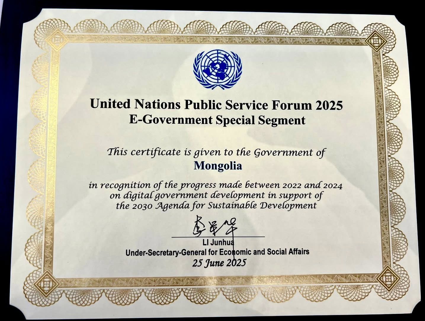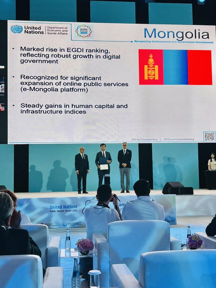 Нэгдсэн Үндэсний Байгууллагын Эдийн засаг, нийгмийн газраас Узбекистан Улстай хамтран зохион байгуулж буй “Нийтийн албаны форум”-ын үеэр НҮБ-ын “E-Government Survey” судалгааны хүрээнд бүрдүүлсэн дата мэдээлэлд үндэслэн 2022-2024 онд төрийн үйлчилгээг цахимжуулах чиглэлд гаргасан ахиц дэвшлийг үнэлж, 12 улсад батламж гардуулах ёслол болов.