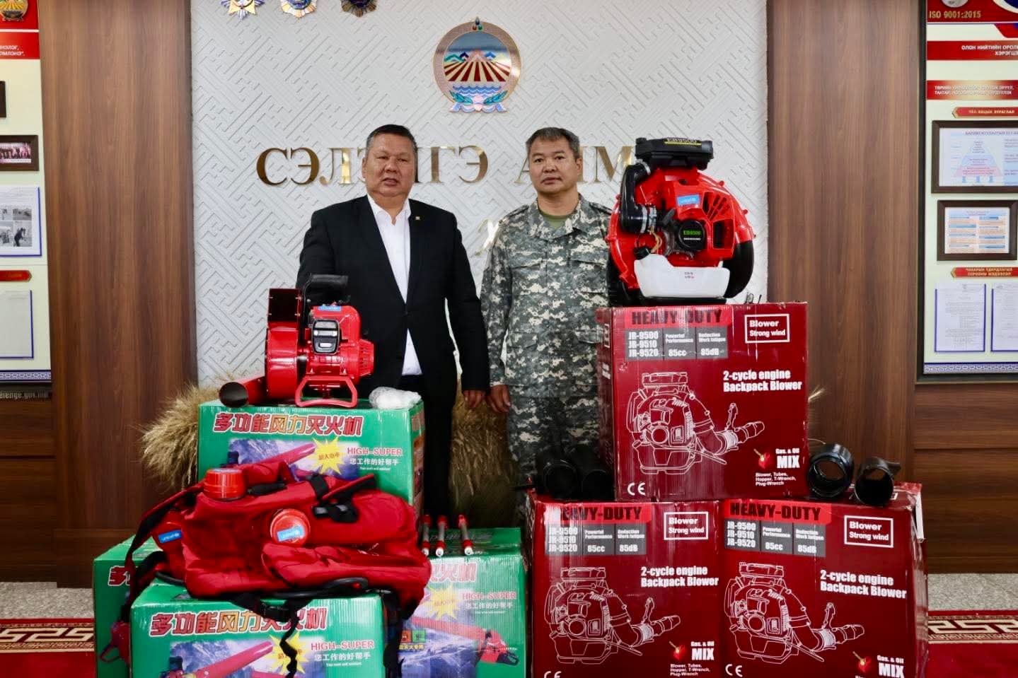 Өнөөдөр тус сангаас 30 ширхэг гал унтраах, үлээгч төхөөрөмж өгснийг аймгийн Засаг дарга Н.Лхагвадорж Сэлэнгэ аймгийн Онцгой байдлын газрын дарга, хурандаа С.Пүрэвсамданд үлээгч аппарат, үүрдэг үлээгч аппарат тус бүр 5 ширхгийг хүлээлгэн өглөө. Бусад төхөөрөмжийг түймрийн голомтод ажиллаж буй мэргэжлийн ангиудад хүлээлгэн өгөхөөр боллоо.