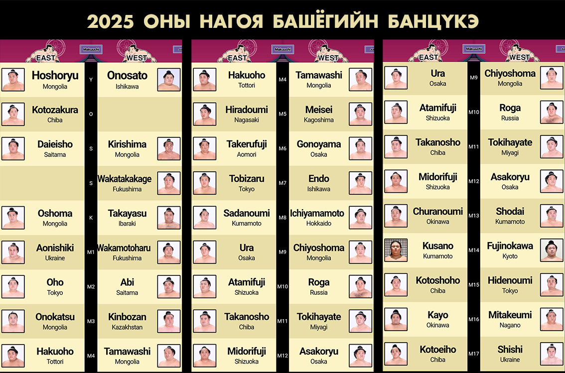 Монголоос Макүүчид Хоошёорюү С.Бямбасүрэн /ёкозүна/, Киришима Б.Лхагвасүрэн /сэкивакэ/, Оошома П.Дэлгэрбаяр /комүсүби/, Онокацү Б.Чойжилсүрэн /М3/, Тамаваши Б.Мөнх-Оргил /М4/, Чиёошома Г.Мөнхсайхан /М9/, Рога А.Амарсанаа /М10/ нарын зэрэг 7 бөх барилдана.