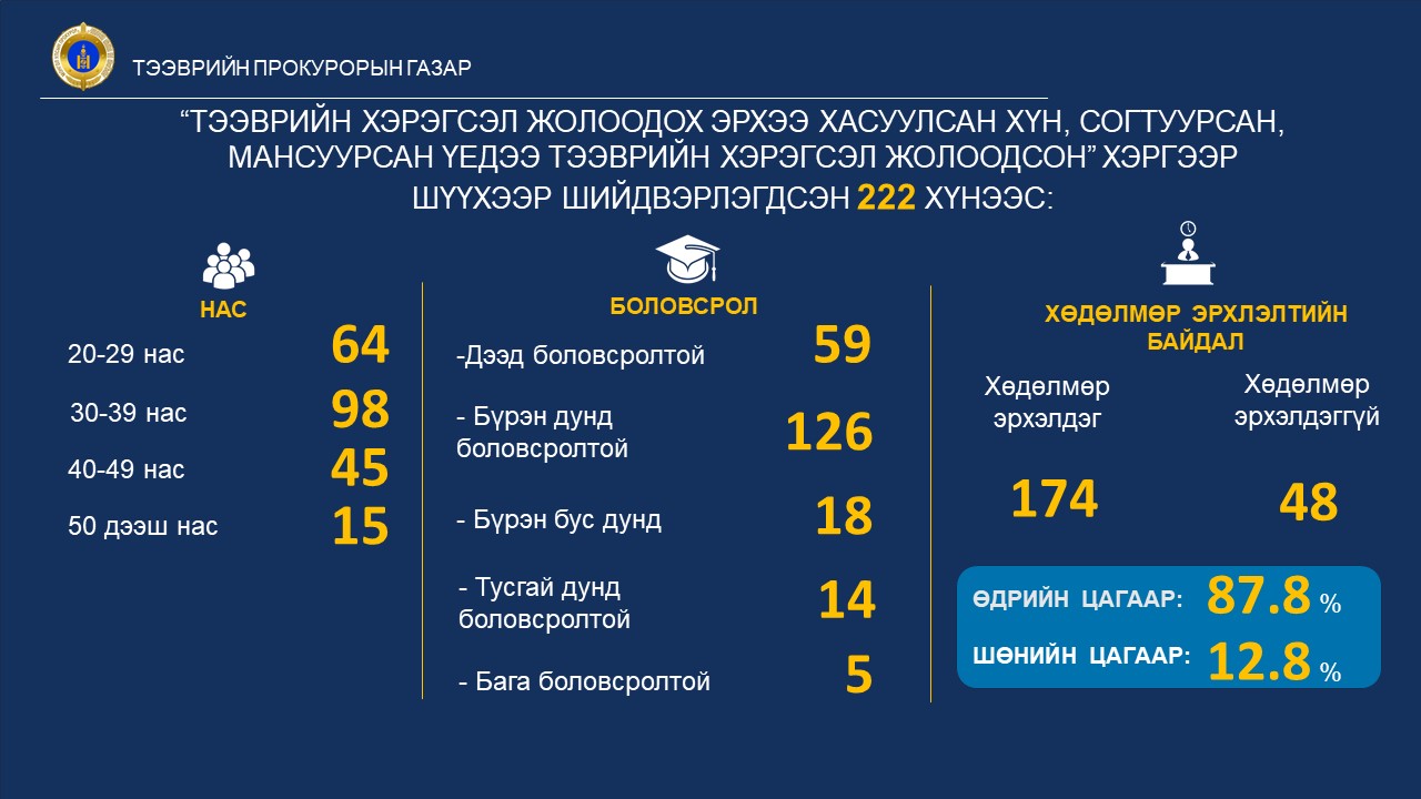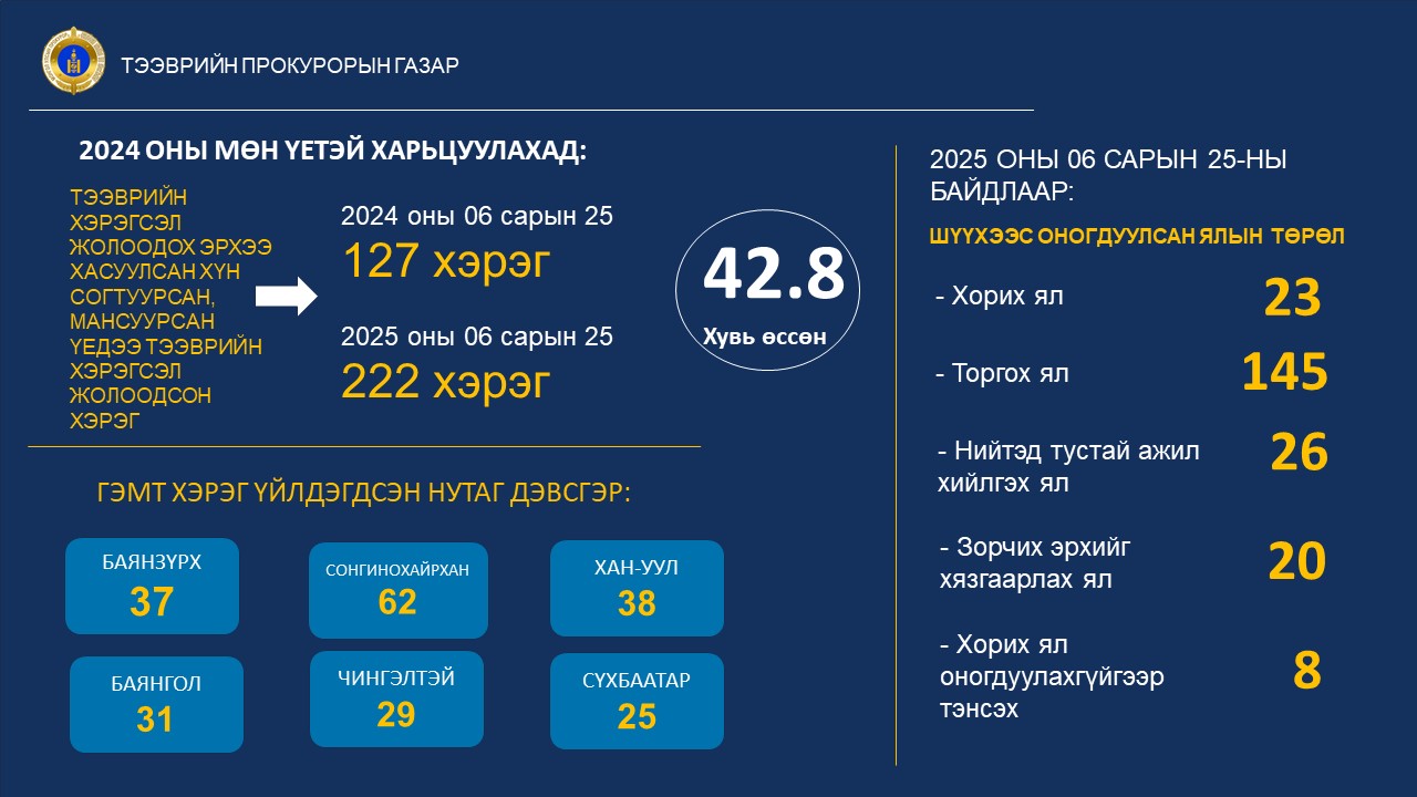 2025 оны 06 сарын 25-ны өдрийн байдлаар “Тээврийн хэрэгсэл жолоодох эрхээ хасуулсан хүн согтуурсан, мансуурсан үедээ тээврийн хэрэгсэл жолоодсон” 230 хүнд холбогдох хэргийг шүүхэд шилжүүлсэн нь өмнөх оны мөн үетэй харьцуулахад 71 хэргээр буюу 69 хувиар, 222 хүнд холбогдох хэргийг шүүхээр эцэслэн шийдвэрлүүлсэн нь 95 хэргээр буюу 57 хувиар тус тус өссөн байна.