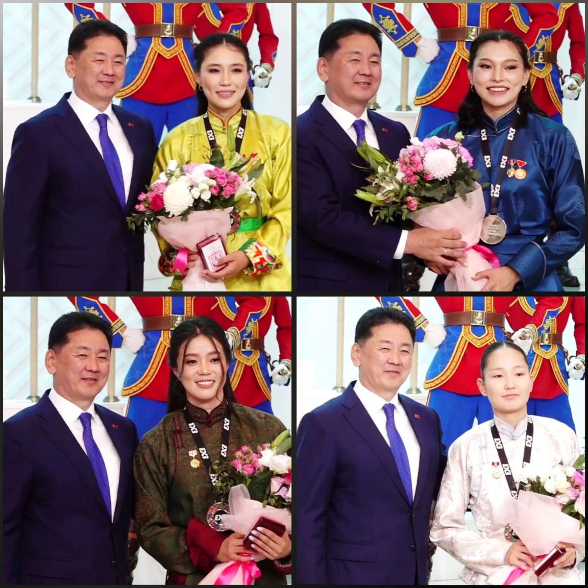 Улаанбаатарт өнгөрсөн зургаадугаар сарын 23-29-нд болсон сагсанбөмбөгийн 3х3-ийн ДАШТ-ээс мөнгөн медаль хүртсэн эмэгтэйчүүдийн шигшээ багийн тамирчдад өнөөдөр Монгол Улсын Ерөнхийлөгч У.Хүрэлсүх Гавъяат тамирчин цол олголоо.