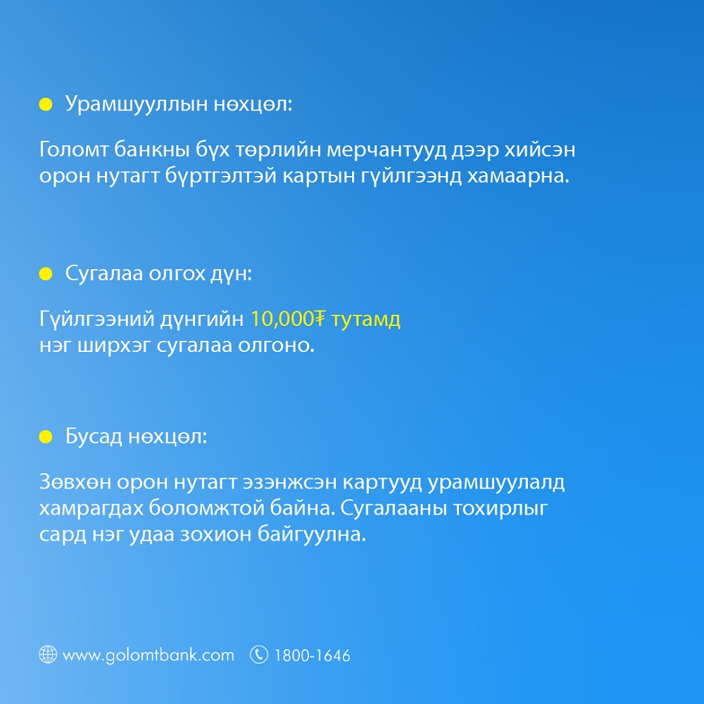 Урамшуулалтай холбоотой дэлгэрэнгүй мэдээллийг та Харилцагчийн үйлчилгээний төвийн 1800-1646 дугаарт хандан эсвэл өөрийн аймагт байрлах Голомт банкны салбар, тооцооны төвүүдээс лавлаарай.