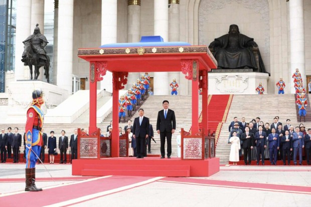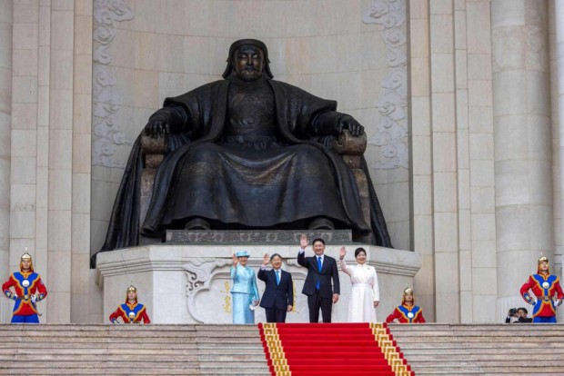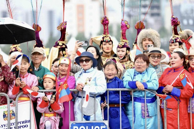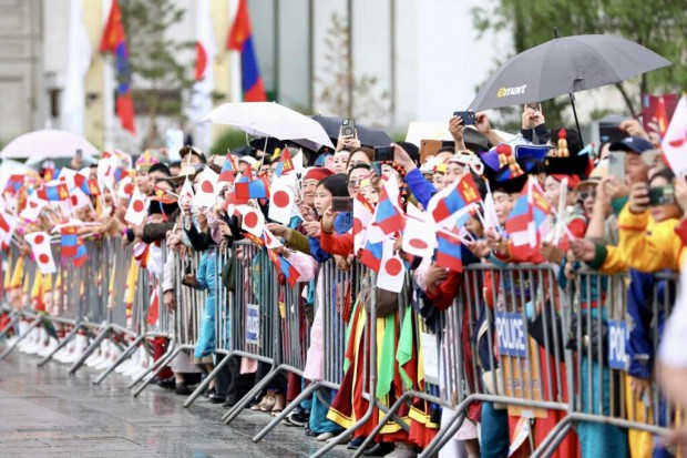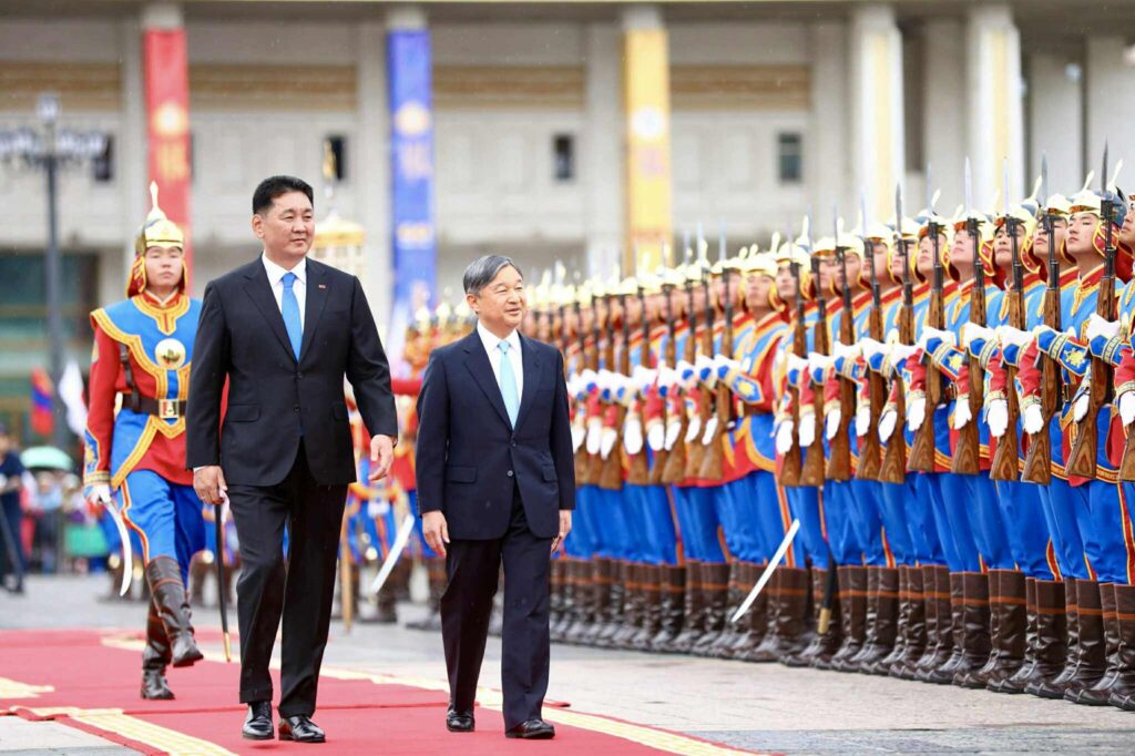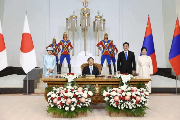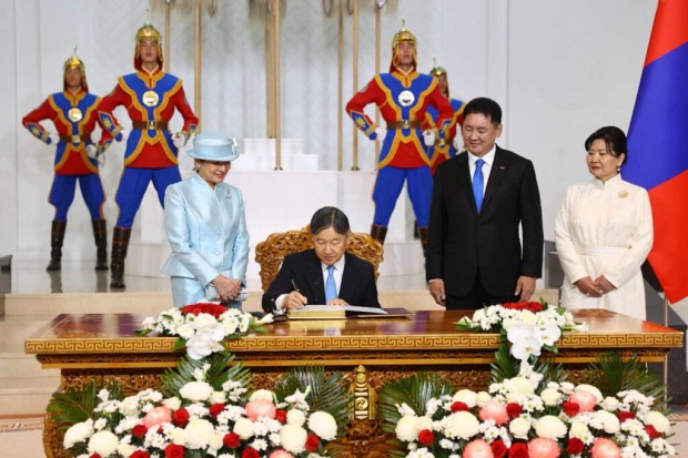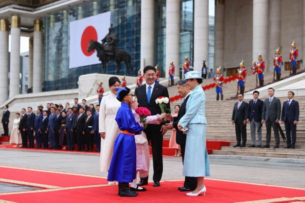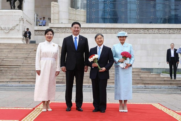 Монгол Улсын Ерөнхийлөгч Ухнаагийн Хүрэлсүх, гэргий Лувсандоржийн Болорцэцэгийн хамт Япон Улсын Цог Жавхлант Эзэн Хаан Нарүхито, Эрхэм дээд Хатан Масако нарыг Д.Сүхбаатарын талбайд албан ёсоор угтан авлаа.