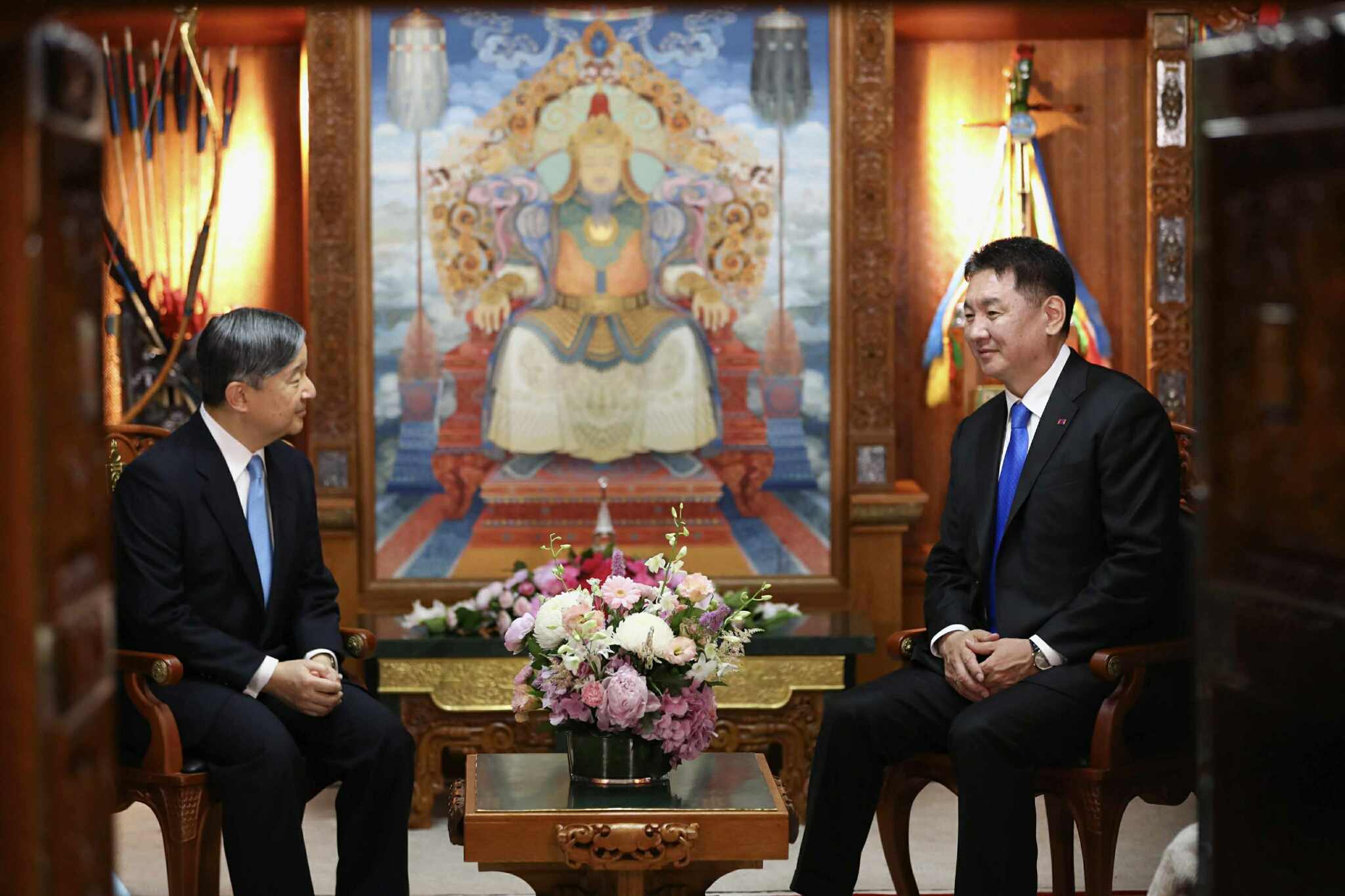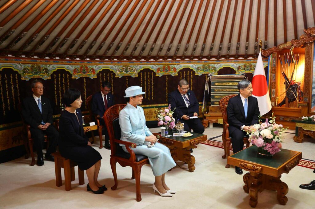 Монгол Улсын Ерөнхийлөгч Ухнаагийн Хүрэлсүх, гэргий Лувсандоржийн Болорцэцэг болон Япон Улсын Цог Жавхлант Эзэн Хаан Нарүхито, Эрхэм дээд Хатан Масако нар албан ёсны уулзалт хийлээ.