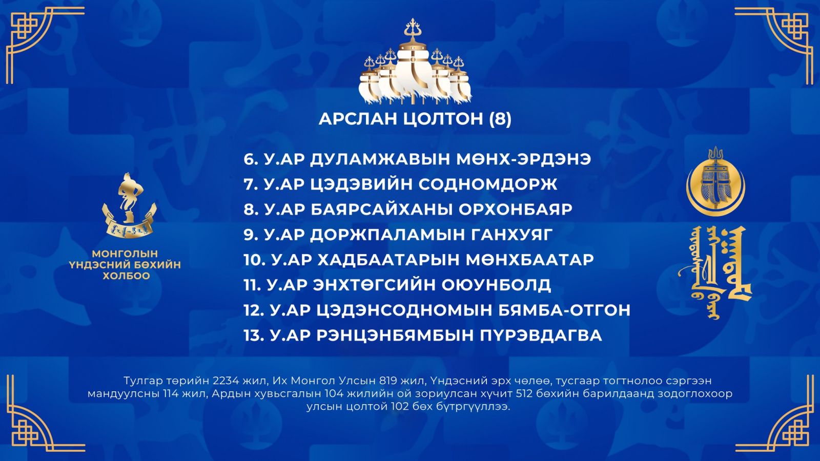 Тулгар төрийн 2234 жил, Их Монгол Улсын 819 жил, Үндэсний эрх чөлөө, тусгаар тогтнолоо сэргээн мандуулсны 114 жил, Ардын хувьсгалын 104 жилийн ой, Үндэсний их баяр наадмын хүчит бөхийн барилдаанд бүртгүүлсэн улсын цолтой бөхчүүдийг танилцуулъя.