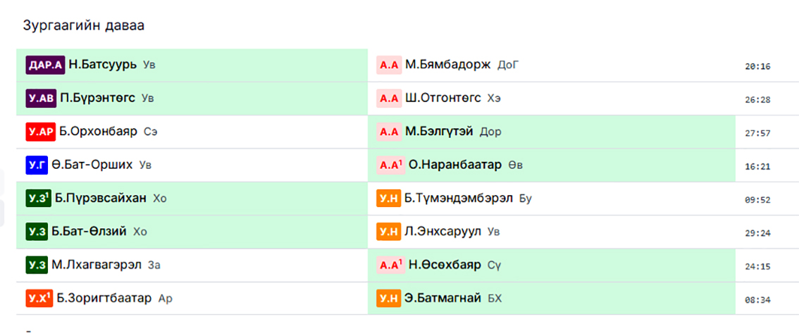Ийнхүү долоогийн даваанд Дархан аварга Н.Батсуурь, Улсын аварга П.Бүрэнтөгс, Улсын заан Б.Пүрэвсайхан, Б.Бат-Өлзий, Улсын начин Э.Батмагнай, аймгийн хурц арслан О.Наранбаатар, Н.Өсөхбаяр, аймгийн арслан М.Бэлгүтэй нар шалгаран үлдээд байна.