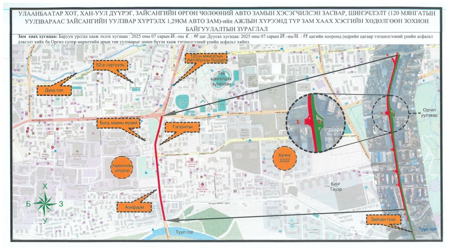 Зайсангийн өргөн чөлөөний авто замын засвар, шинэчлэлтийн ажлын хүрээнд Тэмээтэй хөшөөний уулзвараас Зайсангийн гүүр хүртэлх авто замыг хэсэгчлэн хааж, шинэчлэх ажлыг өнөөдрөөс эхлүүллээ.